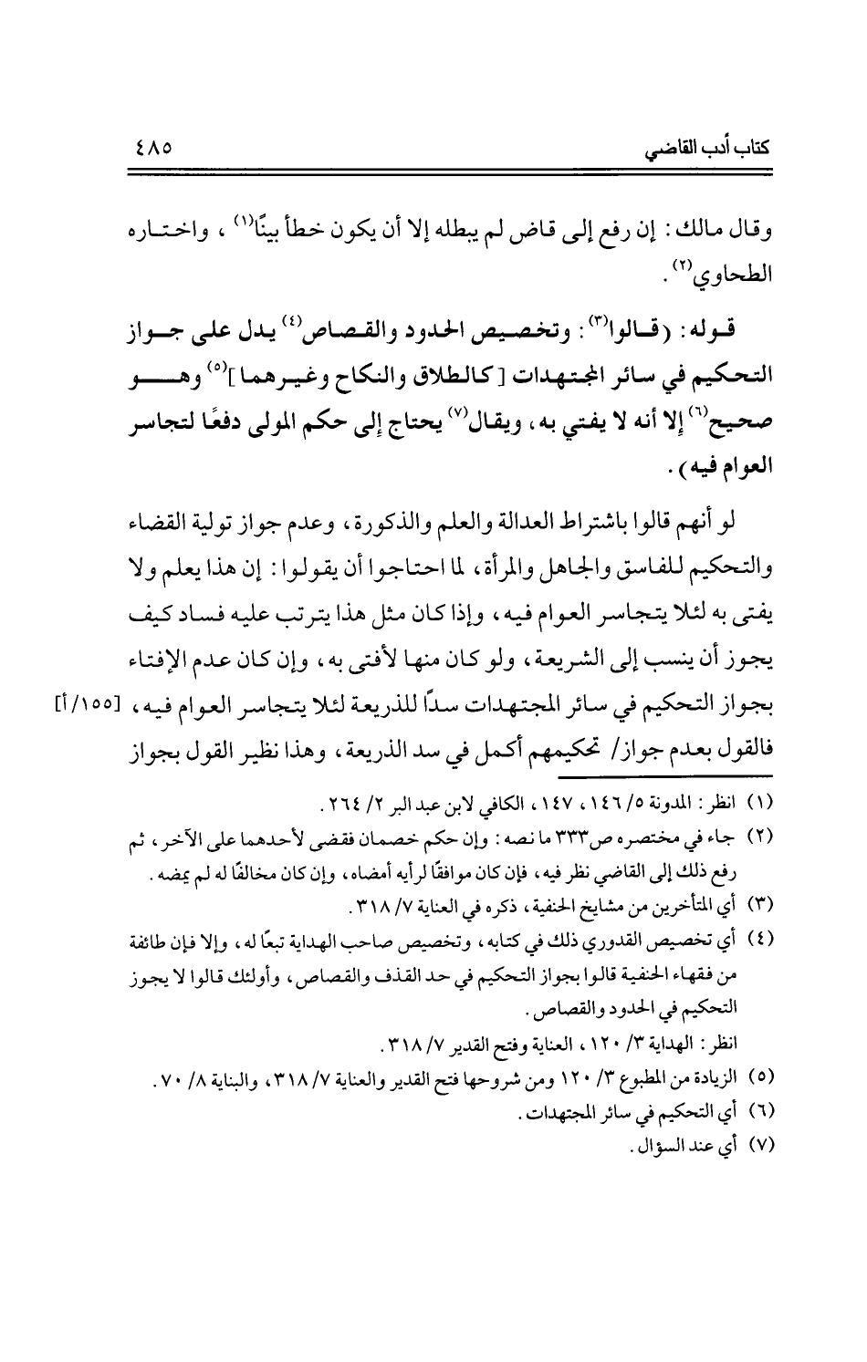 قوله: (قالوا: وتخصيص الحدود والقصاص يدل على جواز التحكيم في سائر المجتهدات [كالطلاق والنكاح وغيرهما] وهو صحيح إلا أنه لا يفتي به، ويقال يحتاج إلى حكم المولى دفعاً لتجاسر العوام فيه).