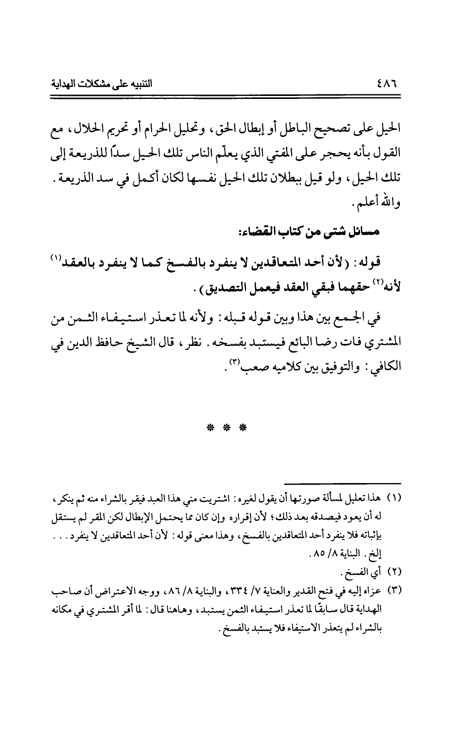 في الجمع بين هذا وبين قوله قبله: ولأنه لما تعذر استيفاء الثمن من المشتري فات رضا البائع فيستبد بفسخه. نظر، قال الشيخ حافظ الدين في الكافي: والتوفيق بين كلاميه صعب.