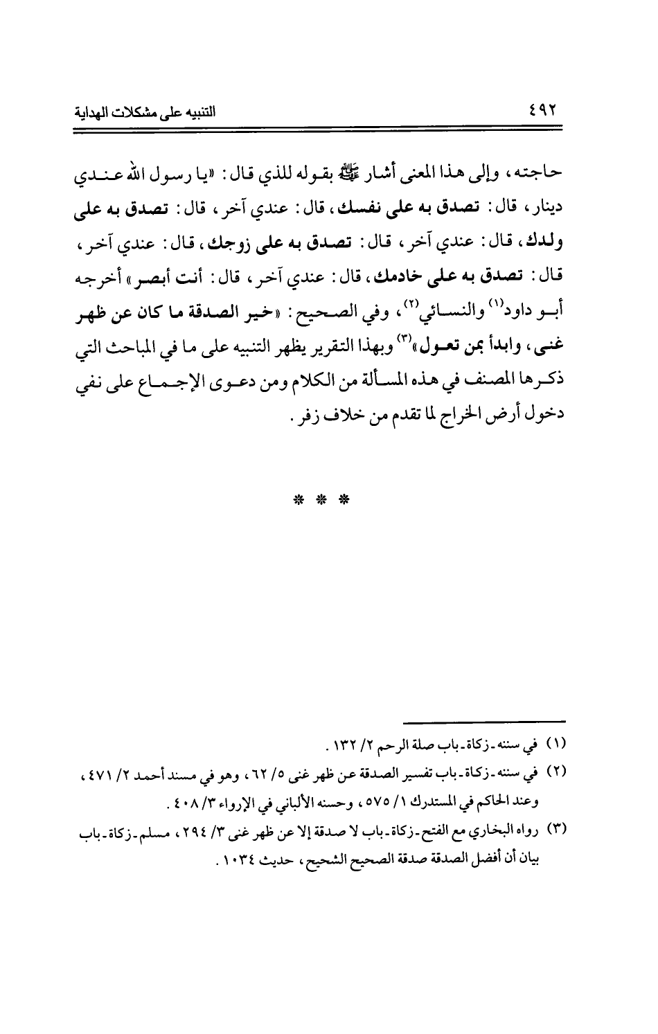 حاجته، وإلى هذا المعنى أشار -صلى الله عليه وسلم- بقوله للذي قال: "يا رسول الله عندي دينار، قال: تصدق به على نفسك، قال: عندي آخر، قال: تصدق به على ولدك، قال: عندي آخر، قال: تصدق به على زوجك، قال: عندي آخر، قال: تصدق به على خادمك، قال: عندي آخر، قال: أنت أبصر" أخرجه أبو داود والنسائي، وفي الصحيح: "خير الصدقة ما كان عن ظهر غنى، وابدأ بمن تعول" وبهذا التقرير يظهر التنبيه على ما في المباحث التي ذكرها المصنف في هذه المسألة من الكلام ومن دعوى الإجماع على نفي دخول أرض الخراج لما تقدم من خلاف زفر.