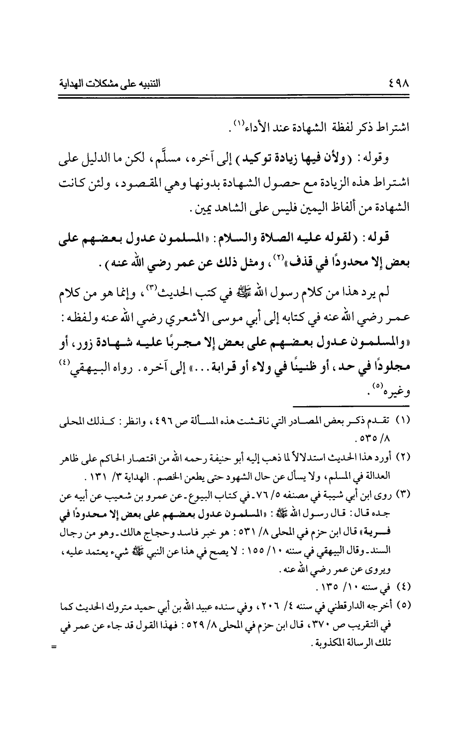 قوله: (لقوله عليه الصلاة والسلام: "والمسلمون عدول بعضهم على بعض إلا محدوداً في قذف"، ومثل ذلك عن عمر رضي الله عنه).