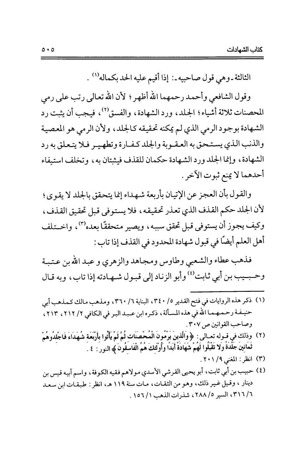والقول بأن العجز عن الإتيان بأربعة شهداء إنما يتحقق بالجلد لا يقوى؛ لأن الجلد حكم القذف الذي تعذر تحقيقه، فلا يستوفى قبل تحقيق القذف، وكيف يجوز أن يستوفى قبل تحقق سببه، ويصير متحققاً بعده، واختلف أهل العلم أيضاً في قبول شهادة المحدود في القذف إذا تاب: