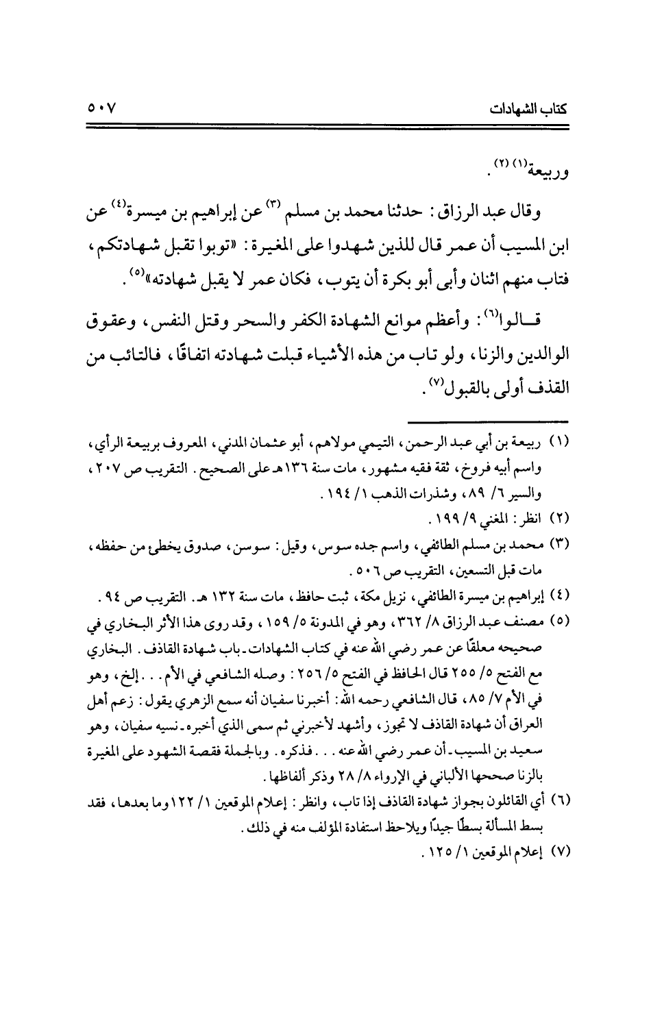 وقال عبد الرزاق: حدثنا محمد بن مسلم عن إبراهيم بن ميسرة عن ابن المسيب أن عمر قال للذين شهدوا على المغيرة: "توبوا تقبل شهادتكم، فتاب منهم اثنان وأبى أبو بكرة أن يتوب، فكان عمر لا يقبل شهادته".