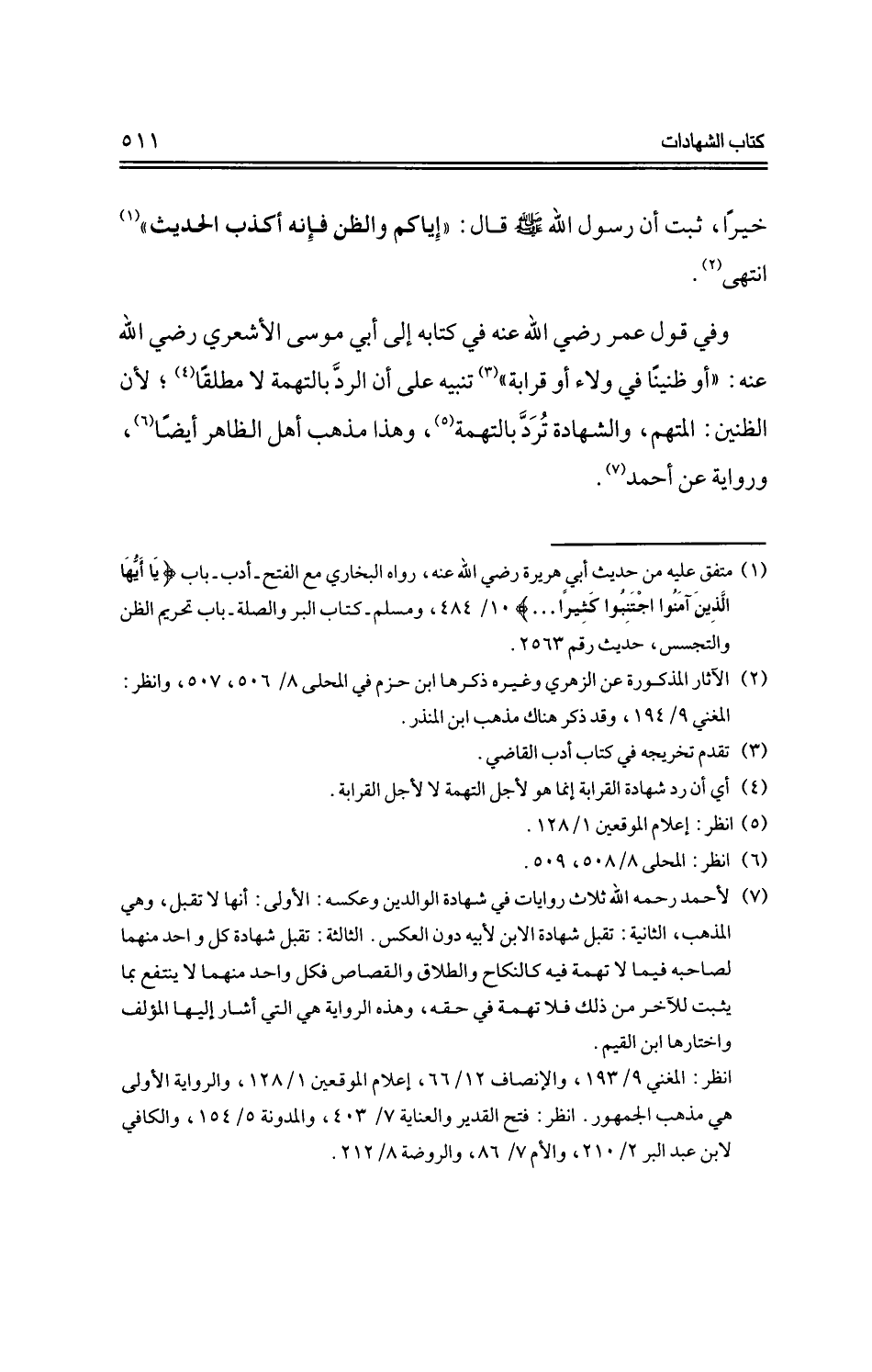 وفي قول عمر رضي الله عنه في كتابه إلى أبي موسى الأشعري رضي الله عنه: "أو ظنينا في ولاء أو قرابة" تنبيه على أن الرد بالتهمة لا مطلقاً؛ لأن الظنين: المتهم، والشهادة ترد بالتهمة، وهذا مذهب أهل الظاهر أيضاً، ورواية عن أحمد.