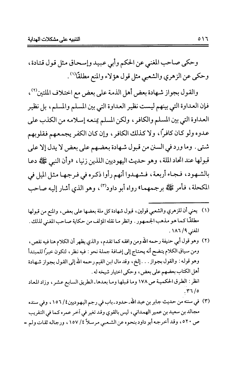 والقول بجواز شهادة بعض أهل الذمة على بعض مع اختلاف الملتين، فإن العداوة التي بينهم ليست نظير العداوة التي بين المسلم والمسلم، بل نظير العداوة التي بين المسلم والكافر، ولكن المسلم يمنعه إسلامه من الكذب على عدوه ولو كان كافراً، ولا كذلك الكافر، وإن كان الكفر يجمعهم بقلوبهم شتى. وما ورد في السنن من قبول شهادة بعضهم على بعض لا يدل إلا على قبولها عند اتحاد الملة، وهو حديث اليهوديين اللذين زنيا، "وأن النبي -صلى الله عليه وسلم- دعا بالشهود، فجاء أربعة، فشهدوا أنهم رأوا ذكره في فرجها مثل الميل في المكحلة، فأمر -صلى الله عليه وسلم- برجمهما" رواه أبو داود، وهو الذي أشار إليه صاحب
