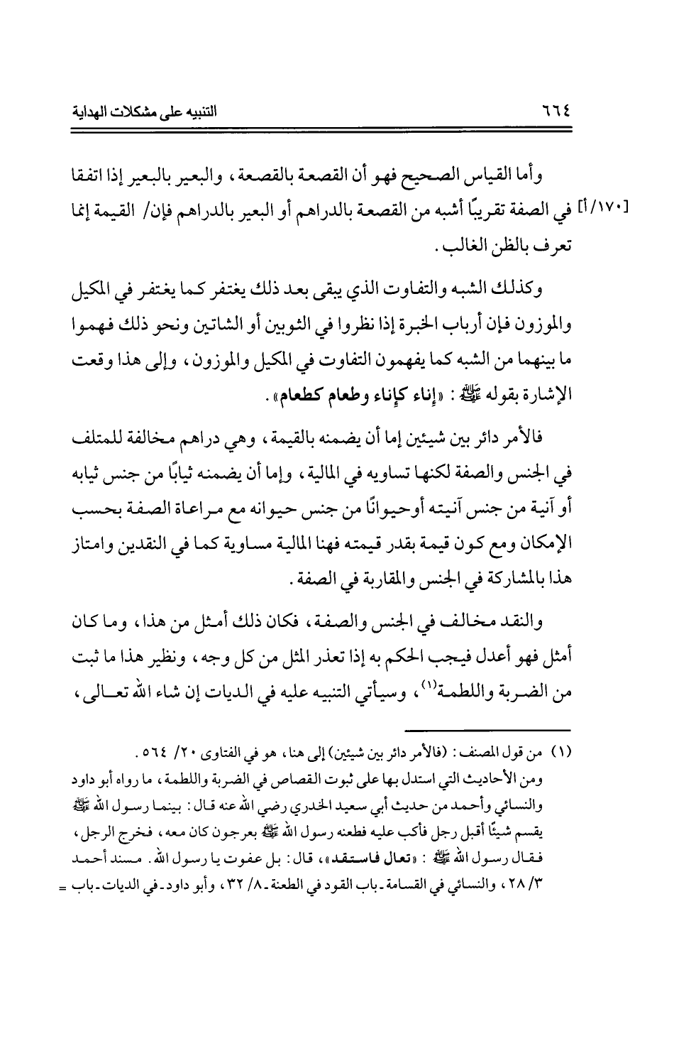 وكذلك الشبه والتفاوت الذي يبقى بعد ذلك يغتفر كما يغتفر في المكيل والموزون فإن أرباب الخبرة إذا نظروا في الثوبين أو الشاتين ونحو ذلك فهموا ما بينهما من الشبه كما يفهمون التفاوت في المكيل والموزون، وإلى هذا وقعت الإشارة بقوله -صلى الله عليه وسلم-: «إناء كإناء وطعام كطعام».