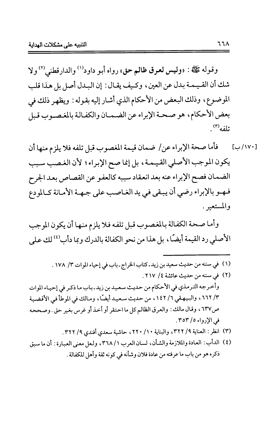 وقوله -صلى الله عليه وسلم-: «وليس لعرق ظالم حق» رواه أبو داود والدارقطني ولا شك أن القيمة بدل عن العبن، وكيف يقال: إن البدل أصل بل هذا قلب الموضوع، وذلك البعض من الأحكام الذي أشار إليه بقوله: ويظهر ذلك في بعض الأحكام، وهو صحة الإبراء عن الضمان والكفالة بالمغضوب قبل تلفه.