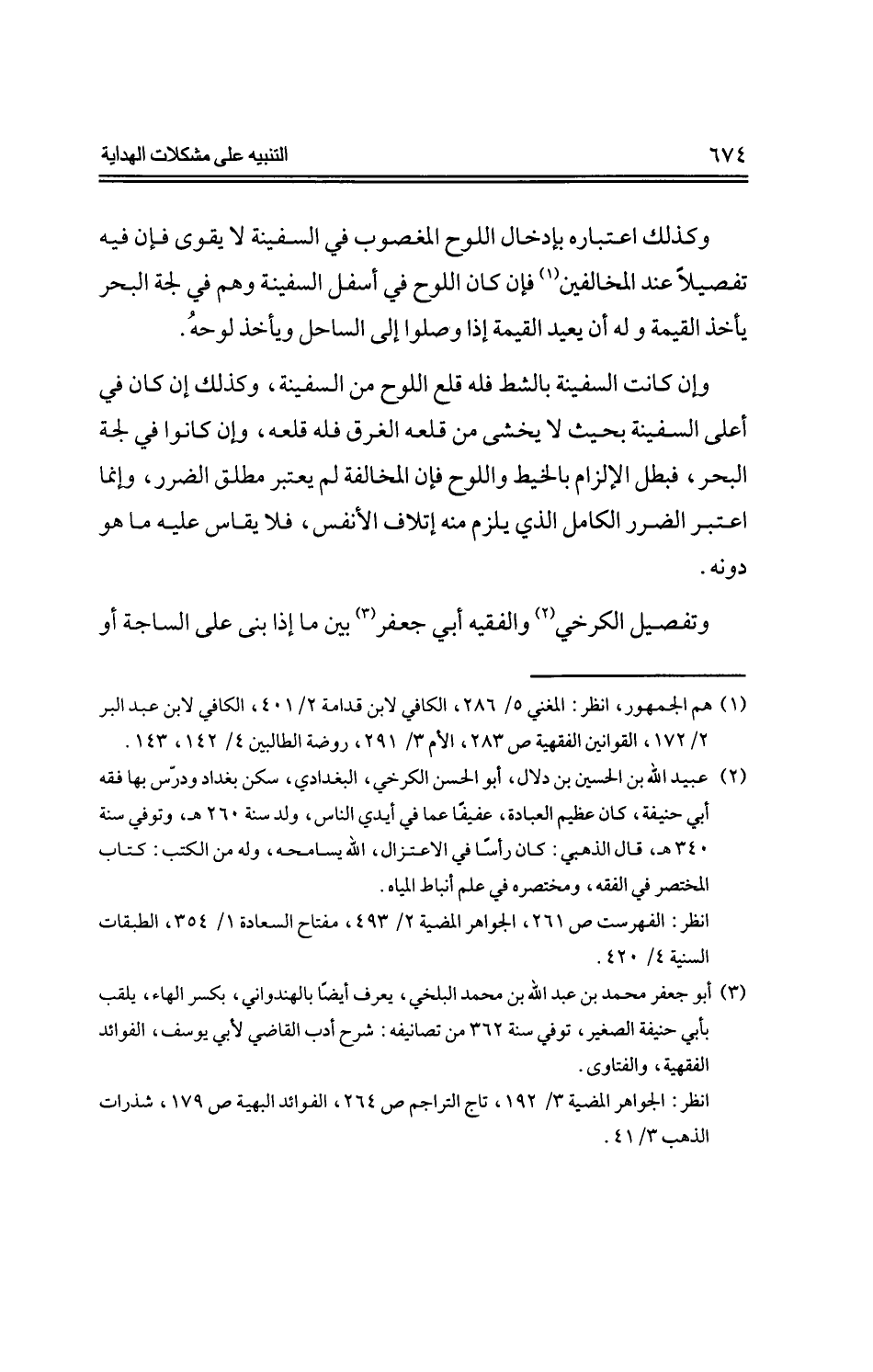 وكذلك اعتباره بإدخال اللوح المغصوب في السفينة لا يقوى فإن فيه تفصيلًا عند المخالفين فإن كان اللوح في أسفل السفينة وهم في لجة البحر يأخذ القيمة وله أن يعيد القيمة إذا وصلوا إلى الساحل ويأخذ لوحه.