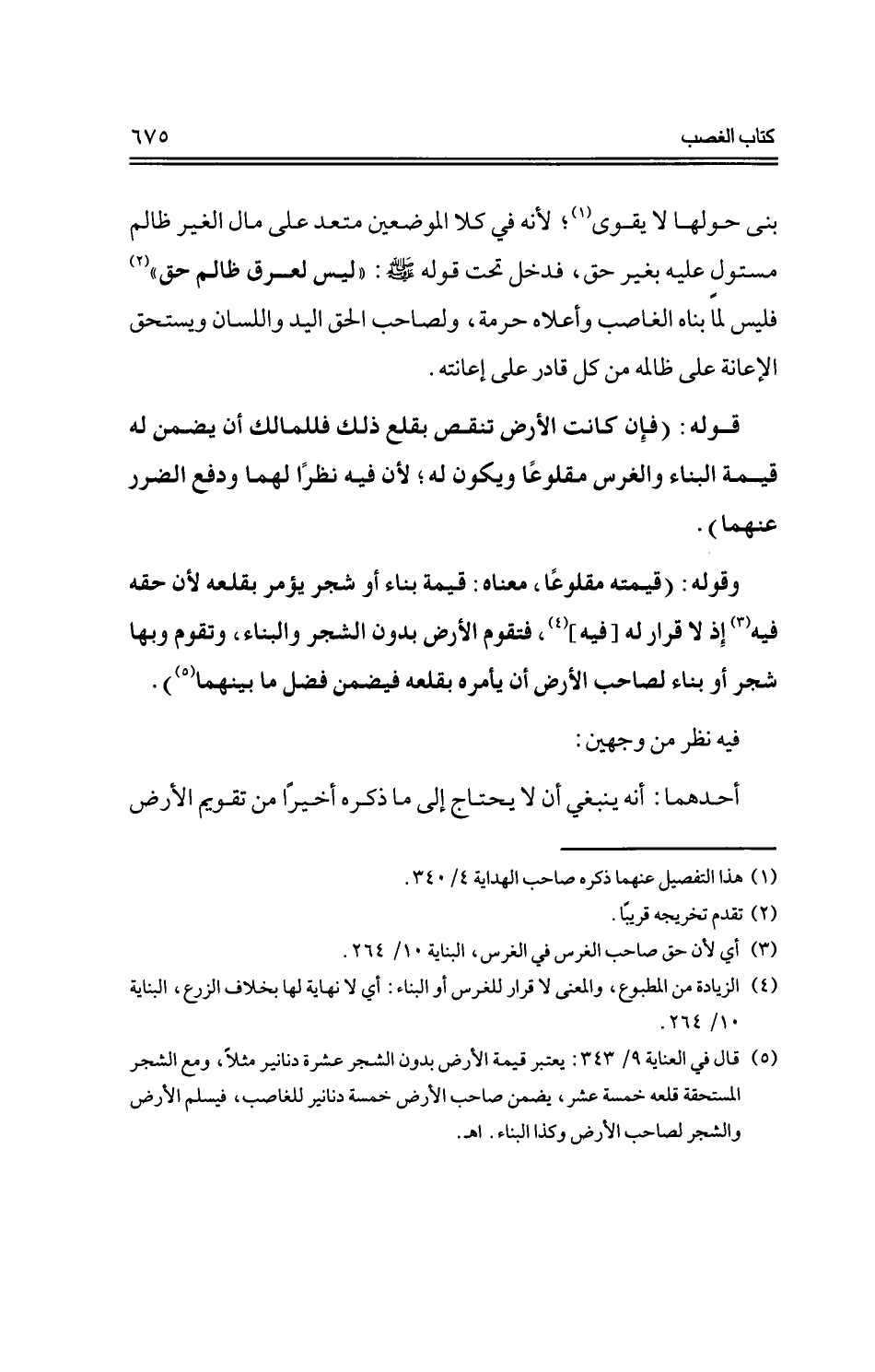 وقوله: (قيمته مقلوعًا، معناه: قيمة بناء أو شجر يؤمر بقلعه لأنه حقه فيه إذ لا قرار له [فيه]، فتقوم الأرض بدون الشجر والبناء، وتقوم وبها شجر أو بناء لصاحب الأرض أن يأمر بقلعه فيضمن فضل ما بينهما).