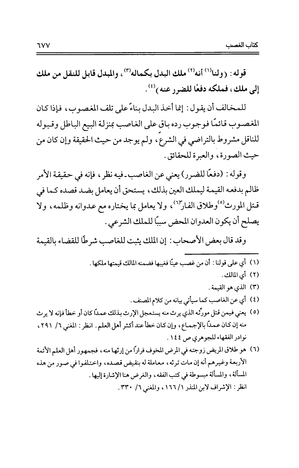 وقوله: (دفعًا للضرر) يعني عن الغاصب - فيه نظر، فإنه في حقيقة الأمر ظالم بدفعه القيمة ليملك العين بذلك، يستحق أن يعامل بضد قصده كما في قتل المورث وطلاق الفارّ، ولا يعامل بما يختاره مع عدوانه وظلمه، ولا يصلح أن يكون العدوان المحض سببًا للملك الشرعي.
