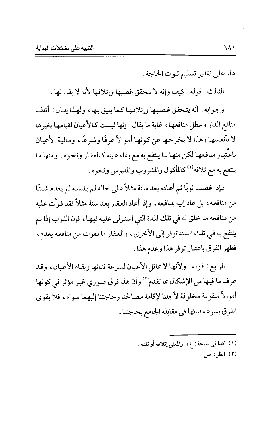 الرابع: قوله: ولأنها لا تماثل الأعيان لسرعة فنائها وبقاء الأعيان، وقد عرف ما فيها من الأشكال مما تقدم وأن هذا فرق صوري غير مؤثر في كونها أموالًا متقومة مخلوقة لأجلنا لإقامة مصالحنا وحاجتنا إليها سواء، فلا يقوى الفرق بسرعة فنائها في مقابة الجامع بحاجتنا.