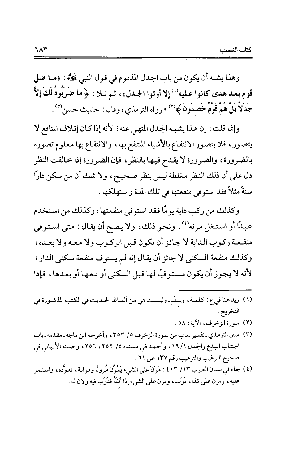 وإنما قلت: إن هذا يشبه الجدل المنهي عنه؛ لأنه إذا كان إتلاف المنافع لا يتصور، فلا يتصور الانتفاع بالأشياء المنتفع بها، والانتفاع بها معلوم تصوره بالضرورة، والضرورة لا يقدح فيها بالنظر، فإن الضرورة إذا خالفت النظر دل على أن ذلك النظر مغلطة ليس بنظر صحيح، ولا شك أن من سكن دارًا سنةً مثلًا فقد استوفى منفعتها في تلك المدة واستهلكها.