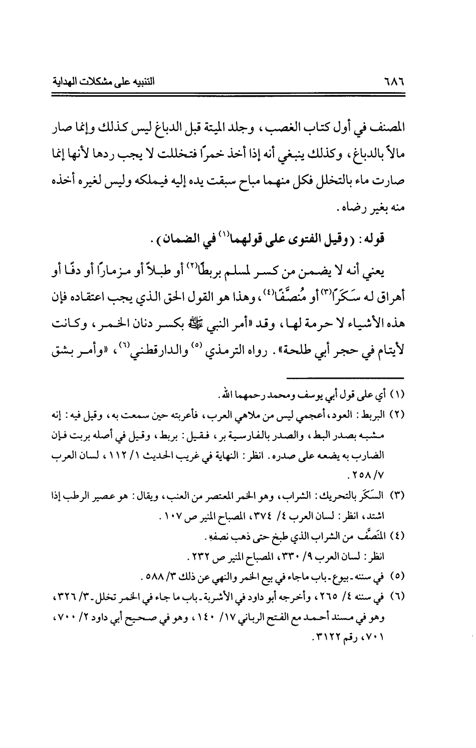 يعني أنه لا يضمن من كسر لمسلم بربطًا أو طبلًا أو مزمارًا أو دفًا أو أهرق له سكرًا أو مصنفًا، وهذا هو القول الحق الذي يجب اعتقاده فإن هذه الأشياء لا حرمة لها، وقد «أمر النبي -صلى الله عليه وسلم- بكسر دنان الخمر، وكانت لأيتام في حجر أبي طلحة». رواه الترمذي والدارقطني، «وأمر بشق
