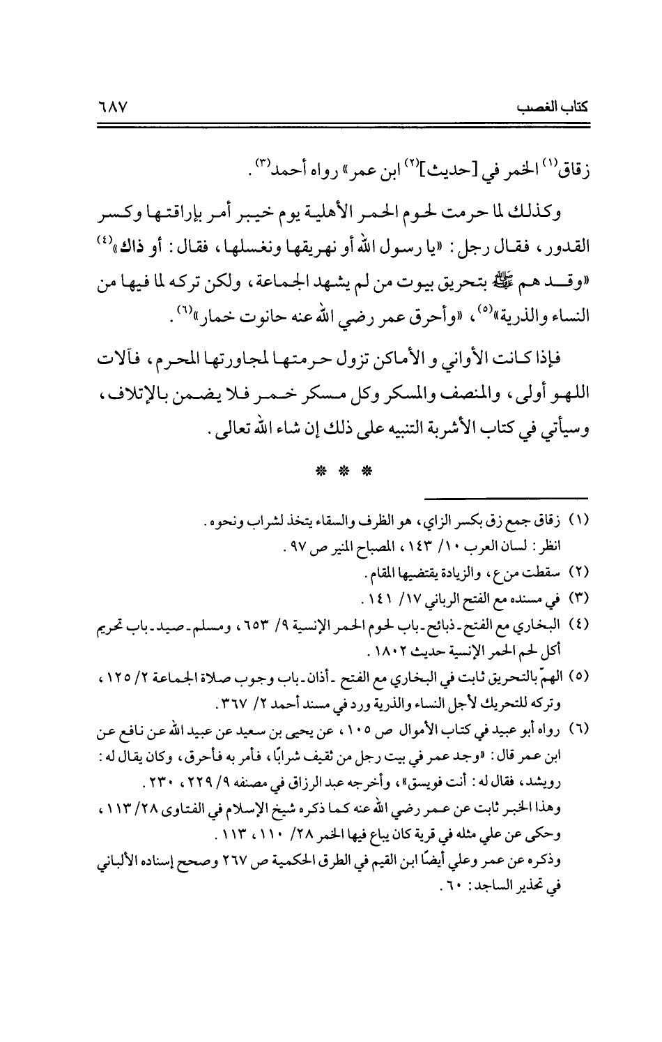 وكذلك لما حرمت لحوم الحمر الأهلية يوم خيبر أمر بإراقتها وكسر القدور، فقال رجل: «يا رسول الله أو نهريقها ونغسلها، فقال: أو ذاك» «وقد هم -صلى الله عليه وسلم- بتحريق بيوت من لم يشهد الجماعة، ولكن تركه لما فيها من النساء والذرية»، «وأحرق عمر رضي الله عنه حانوت خمار».