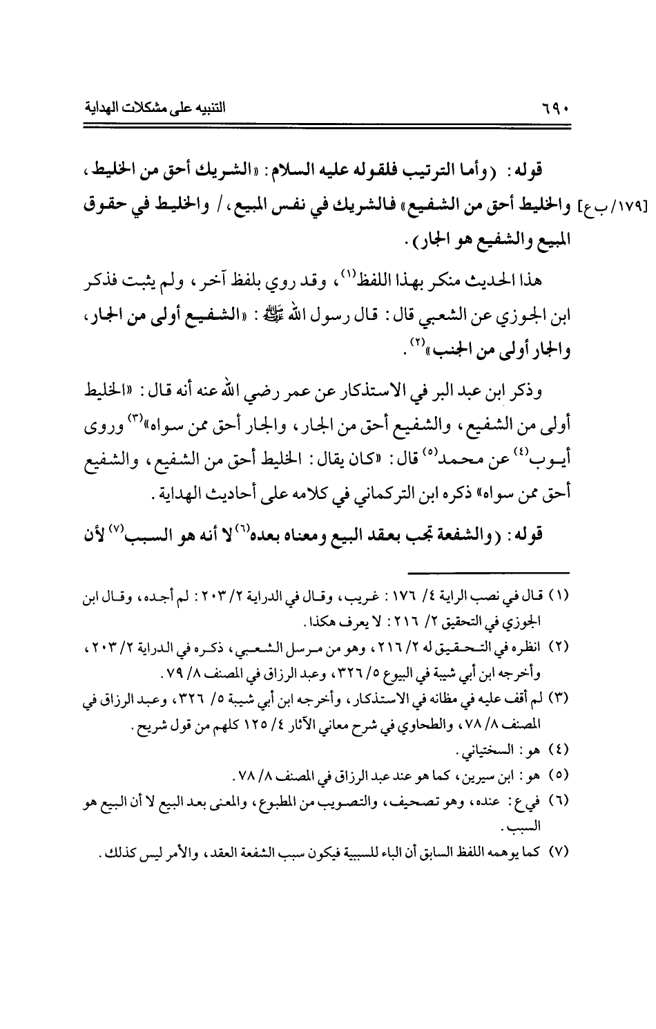 وذكر ابن عبد البر في الاستذكار عن عمر رضي الله عنه أنه قال: «الخليط أولى من الشفيع، والشفيع أحق من الجار، والجار أحق ممن سواه» وروى أيوب عن محمد قال: «كان يقال: الخليط أحق من الشفيع، والشفيع أحق ممن سواه» ذكره ابن التركماني في كلامه على أحاديث الهداية.