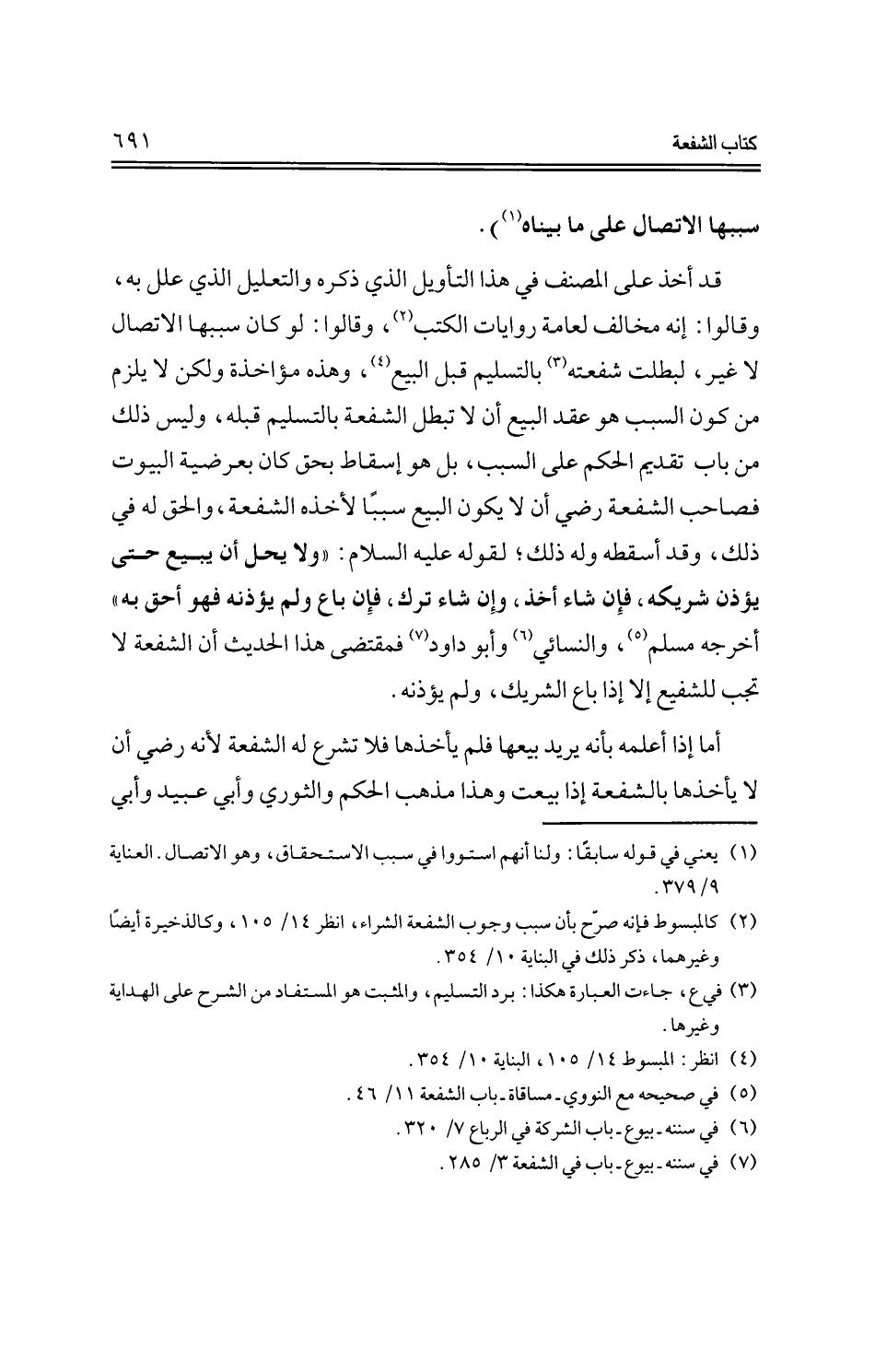 قد أخذ على المصنف في هذا التأويل الذي ذكره والتعليل الذي علل به، وقالوا: إنه مخالف لعامة روايات الكتب، وقالوا: لو كان سببها الاتصال لا غير، لبطلت شفعته بالتسليم قبل البيع، وهذه مؤاخذة ولكن لا يلزم من كون السبب هو عقد البيع أن لا تبطل الشفعة بالتسليم قبله، وليس ذلك من باب تقديم الحكم على السبب، بل هو إسقاط بحق كان بعرضية البيوت فصاحب الشفعة رضي أن لا يكون البيع سببًا لأخذه الشفعة، والحق له في ذلك، وقد أسقطه وله ذلك؛ لقوله عليه السلام: "ولا يحل أن يبيع حتى يؤذن شريكه، فإن شاء أخذ، وإن شاء ترك، فإن باع ولم يؤذنه فهو أحق به" أخرجه مسلم، والنسائي وأبو داود فمقتضى هذا الحديث أن الشفعة لا تجب للشفيع إلا إذا باع الشريك، ولم يؤذنه.