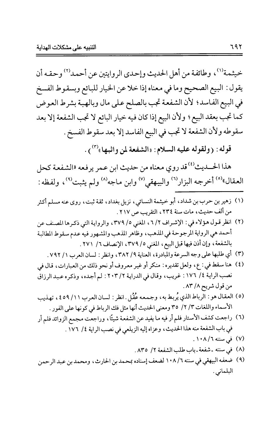 خيثمة، وطائفة من أهل الحديث وإحدى الروايتين عن أحمد وحقه أن يقول: البيع الصحيح وما في معناه إذا خلا عن الخيار للبائع وبسقوط الفسخ في البيع الفاسد؛ لأن الشفعة تجب بالصلح على مال وبالهبة بشرط العوض كما تجب بعقد البيع؛ ولأن البيع إذا كان فيه خيار البائع لا تجب الشفعة إلا بعد سقوطه ولأن الشفعة لا تجب في البيع الفاسد إلا بعد سقوط الفسخ.