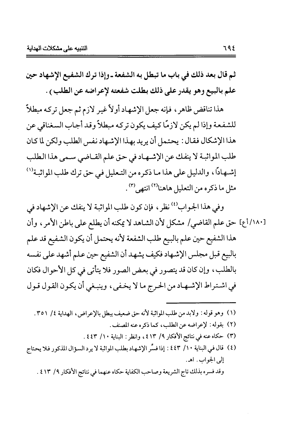 هذا تناقض ظاهر، فإنه جعل الإشهاد أولًا غير لازم ثم جعل تركه مبطلًا للشفعة وإذا لم يكن لازمًا كيف يكون تركه مبطلًا وقد أجاب السغناقي عن هذا الإشكال فقال: يحتمل أن يريد بهذا الإشهاد نفس الطلب ولكن لما كان طلب المواثبة لا ينفك عن الإشهاد في حق علم القاضي سمى هذا الطلب إشهادًا، والدليل على هذا ما ذكره من التعليل في حق ترك طلب المواثبة مثل ما ذكره من التعليل هاهنا انتهى.