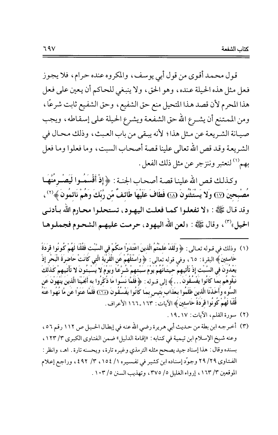 وكذلك قص الله علينا قصة أصحاب الجنة: {إذ أقسموا ليصر منها مصبحين {17} ولا يستثنون {18} فطاف عليها طائف من ربك وهم نائمون}، وقد قال - صلى الله عليه وسلم -: "لا تفعلوا كما فعلت اليهود، تستحلوا محارم الله بأدنى الحيل"، وقال - صلى الله عليه وسلم -: "لعن الله اليهود، حرمت عليهم الشحوم فجملوها