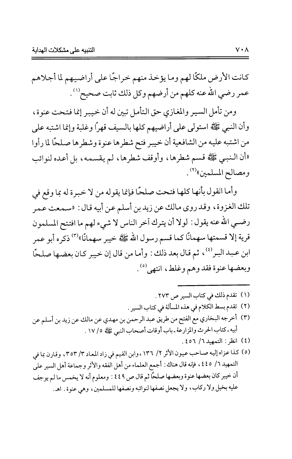 وأما القول بأنها كلها فتحت صلحًا فإنما يقوله من لا خبرة له بما وقع في تلك الغزوة، وقد روى مالك عن زيد بن أسلم عن أبيه قال: "سمعت عمر رضي الله عنه يقول: لولا أن يترك آخر الناس لا شيء لهم ما افتتح المسلمون قرية إلا قسمتها سهمانًا كما قسم رسول الله - صلى الله عليه وسلم - خيبر سهمانًا" ذكره أبو عمر ابن عبد البر، ثم قال بعد ذلك: وأما من قال إن خيبر كان بعضها صلحًا وبعضها عنوة فقد وهم وغلط، انتهى.
