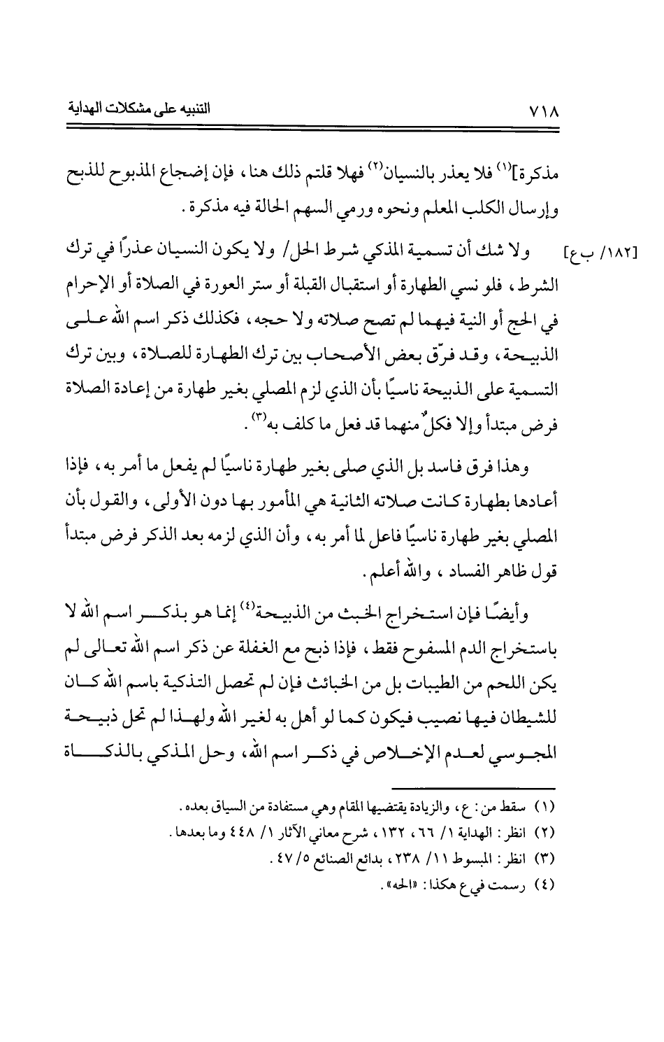 ولا شك أن تسمية المذكي شرط الحل/ ولا يكون النسيان عذرًا في ترك الشرط، فلو نسي الطهارة أو استقبال القبلة أو ستر العورة في الصلاة أو الإحرام في الحج أو النية فيهما لم تصح صلاته ولا حجه، فكذلك ذكر اسم الله على الذبيحة، وقد فرق بعض الأصحاب بين ترك الطهارة للصلاة، وبين ترك التسمية على الذبيحة ناسيًا بأن الذي لزم المصلي بغير طهارة من إعادة الصلاة فرض مبتدأ وإلا فكلٌ منهما قد فعل ما كلف به.