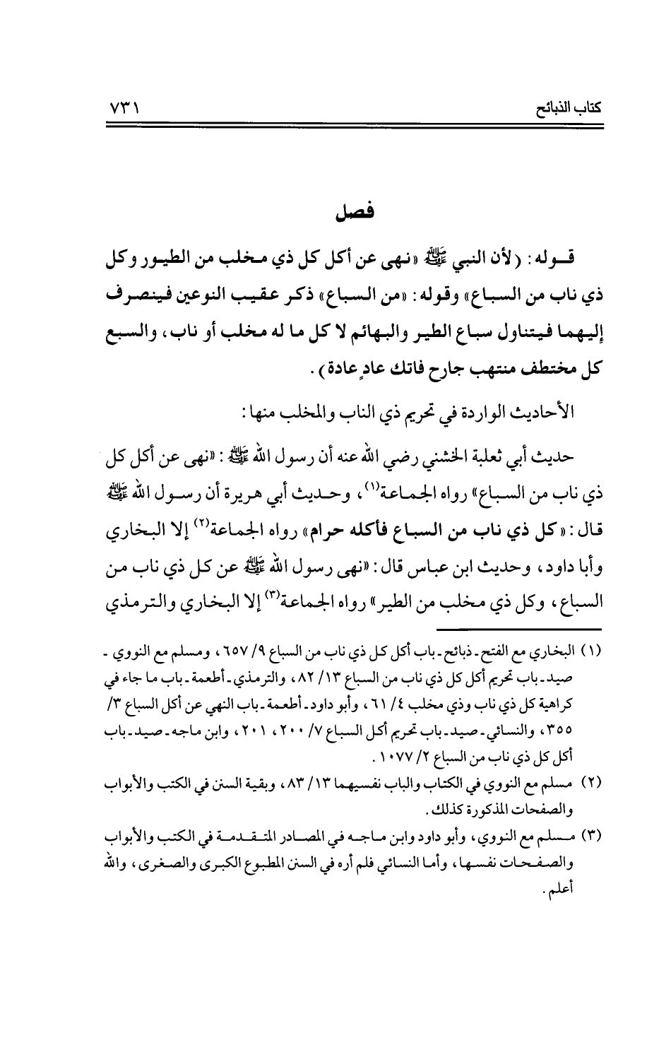 قوله: (لأن النبي -صلى الله عليه وسلم- "نهى عن أكل كل ذي مخلب من الطيور وكل ذي ناب من السباع" وقوله: "من السباع" ذكر عقيب النوعين فينصرف إليهما فيتناول سباع الطير والبهائم لا كل ما له مخلب أو ناب، والسبع كل مختطف منتهب جارح فاتك عادٍ عادة).
