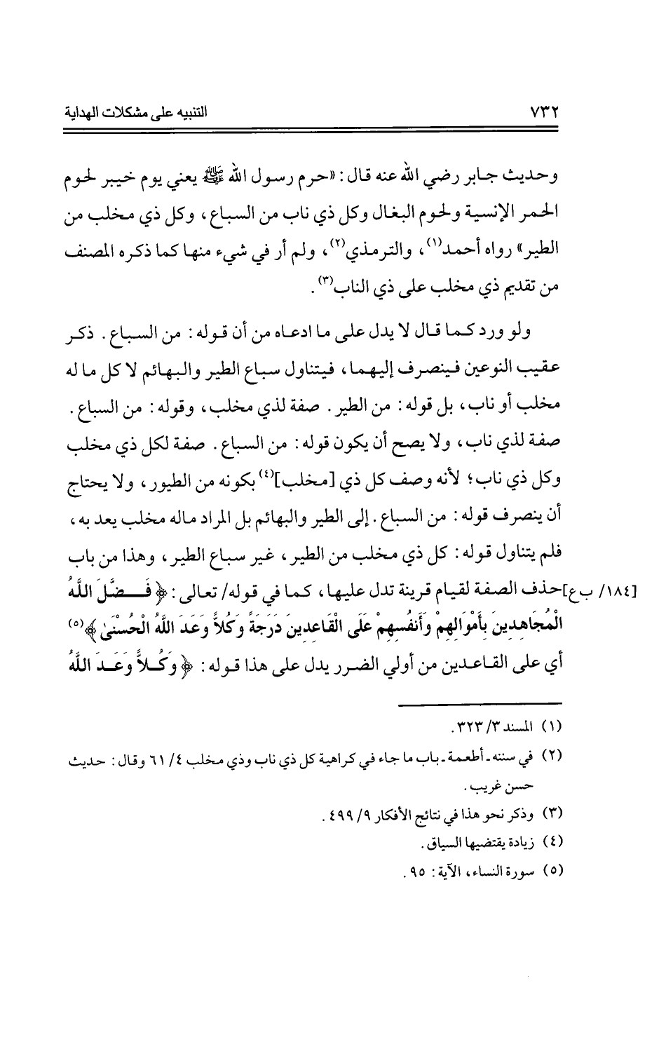 ولو ورد كما قال لا يدل على ما ادعاه من أن قوله: من السباع. ذكر عقيب النوعين فينصرف إليهما، فيتناول سباع الطير والبهائم لا كل ما له مخلب أو ناب، بل قوله: من الطير. صفة لذي مخلب، وقوله: من السباع. صفة لذي ناب، ولا يصح أن يكون قوله: من السباع. صفة لكل ذي مخلب وكل ذي ناب؛ لأنه وصف كل ذي [مخلب] بكونه من الطيور، ولا يحتاج أن ينصرف قوله: من السباع. إلى الطير والبهائم بل المراد ماله مخلب يعد به، فلم يتناول قوله: كل ذي مخلب من الطير، غير سباع الطير، وهذا من باب حذف الصفة لقيام قرينة تدل عليها، كما في قوله/ تعالى: {فضل الله المجاهدين بأموالهم وأنفسهم على القاعدين درجة وكلاً وعد الله الحسنى} أي على القاعدين من أولي الضرر يدل على هذا قوله: {وكلا وعد الله