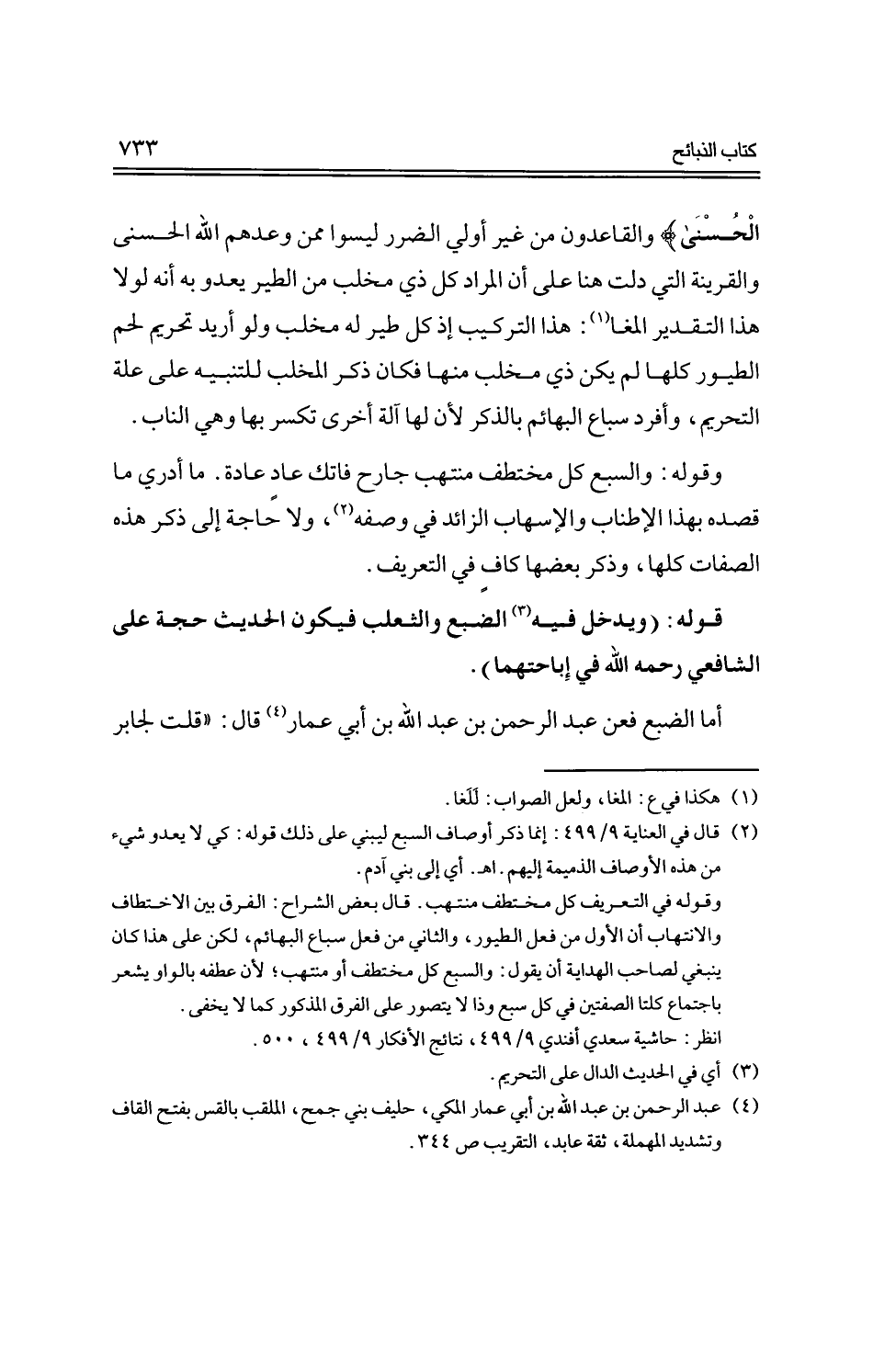 الحسنى} والقاعدون من غير أولي الضرر ليسوا ممن وعدهم الله الحسنى والقرينة التي دلت هنا على أن المراد كل ذي مخلب من الطير يعدو به أنه لولا هذا التقدير المغا: هذا التركيب إذ كل طير له مخلب ولو أريد تحريم لحم الطيور كلها لم يكن ذي مخلب منها فكان ذكر المخلب للتنبيه على علة التحريم، وأفرد سباع البهائم بالذكر لأن لها آلة أخرى تكسر بها وهي الناب.