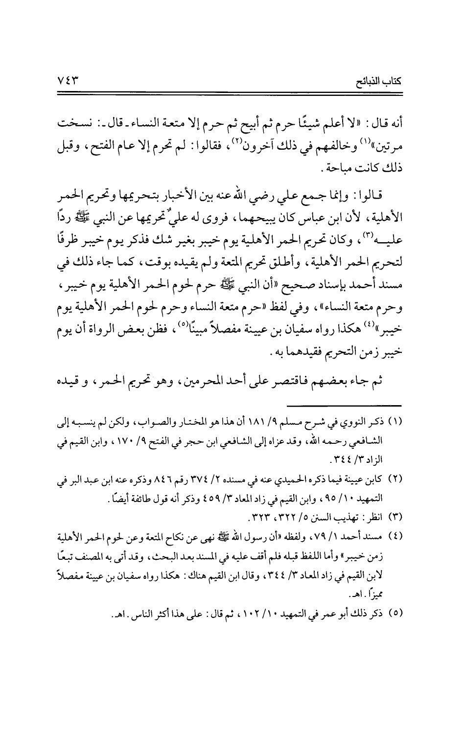 قالوا: وإنما جمع علي -رضي الله عنه- بين الأخبار بتحريمها وتحريم الحمر الأهلية، لأن ابن عباس كان يبيحهما، فروى له علي تحريمها عن النبي -صلى الله عليه وسلم- ردًا عليه، وكان تحريم الحمر الأهلية يوم خيبر بغير شك فذكر يوم خيبر ظرفًا لتحريم الحمر الأهلية، وأطلق تحريم المتعة ولم يقيده بوقت، كما جاء ذلك في مسند أحمد بإسناد صحيح "أن النبي -صلى الله عليه وسلم- حرم لحوم الحمر الأهلية يوم خيبر، وحرم متعة النساء"، وفي لفظ "حرم متعة النساء وحرم لحوم الحمر الأهلية يوم خيبر" هكذا رواه سفيان بن عيينة مفصلاً مبينًا، فظن بعض الرواة أن يوم خيبر زمن التحريم فقيدهما به.
