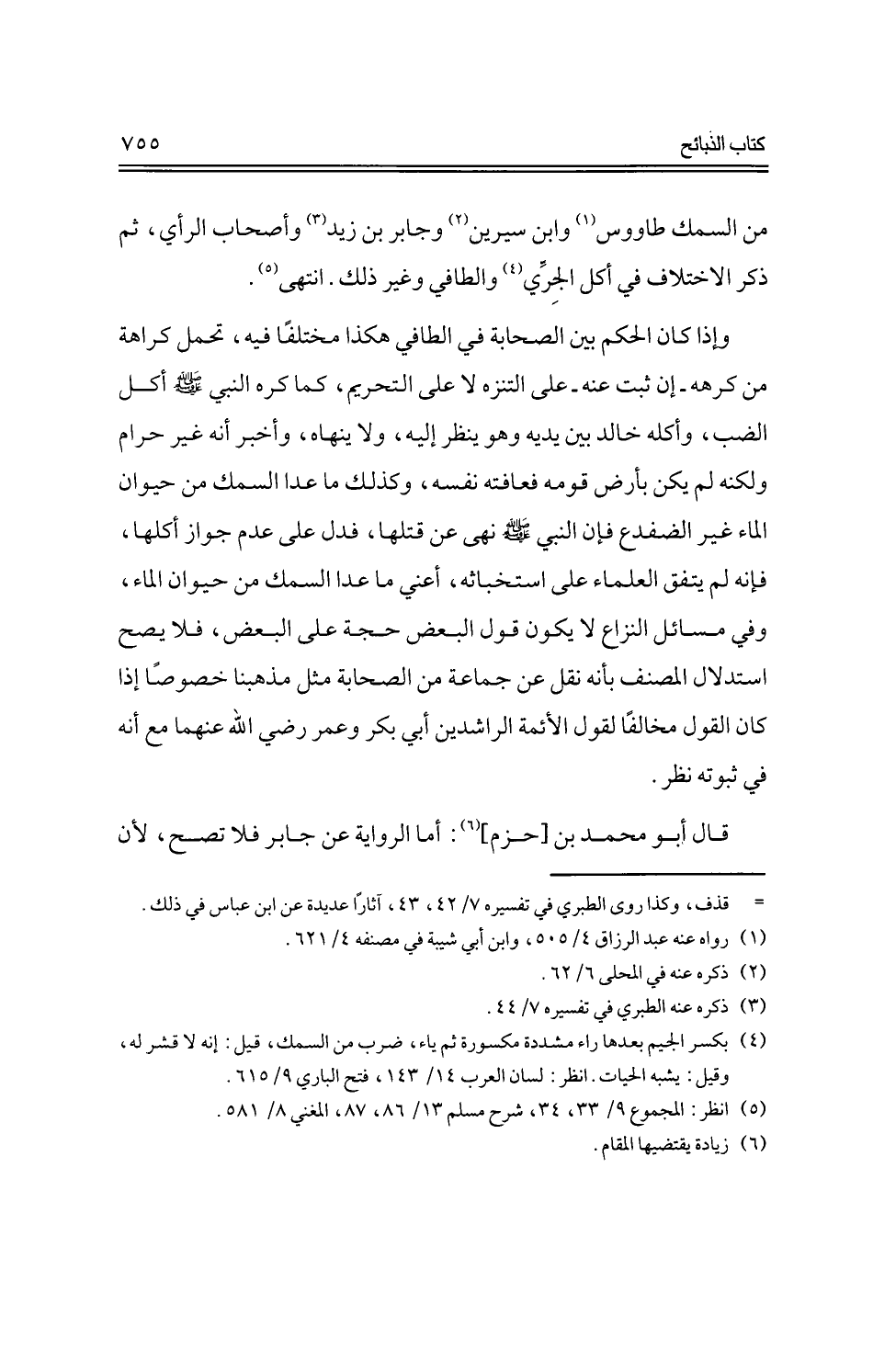 وإذا كان الحكم بين الصحابة في الطافي هكذا مختلفًا فيه، تحمل كراهة من كرهه - إن ثبت عنه- على التنزه لا على التحري، كما كره النبي -صلى الله عليه وسلم- أكل الضب، وأكله خالد بين يديه وهو ينظر إليه، ولا ينهاه، وأخبر أنه غير حرام ولكنه لم يكن بأرض قومه فعافته نفسه، وكذلك ما عدا السمك من حيوان الماء غير الضفدع فإن النبي -صلى الله عليه وسلم- نهى عن قتلها، فدل على عدم جواز أكلها، فإنه لم يتفق العلماء على استخباثه، أعني ما عدا السمك من حيوان الماء، وفي مسائل النزاع لا يكون قول البعض حجة على البعض، فلا يصح استدلال المصنف بأنه نقل عن جماعة من الصحابة مثل مذهبنا خصوصًا إذا كان القول مخالفًا لقول الأئمة الراشدين أبي بكر وعمر رضي الله عنهما مع أنه في ثبوته نظر.