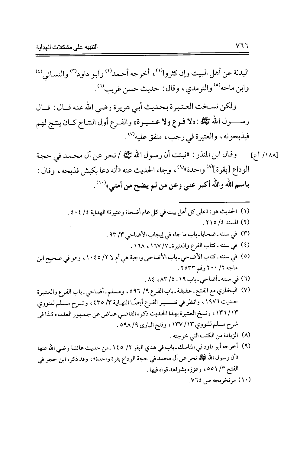 وقال ابن المنذر: "نبئت أن رسول الله -صلى الله عليه وسلم-/ نحر عن آل محمد في حجة الوداع [بقرة] واحدة"، وجاء الحديث عنه "أنه دعا بكبش فذبحه، وقال: باسم اله والله أكبر عني وعن من لم يضح من أمتي".