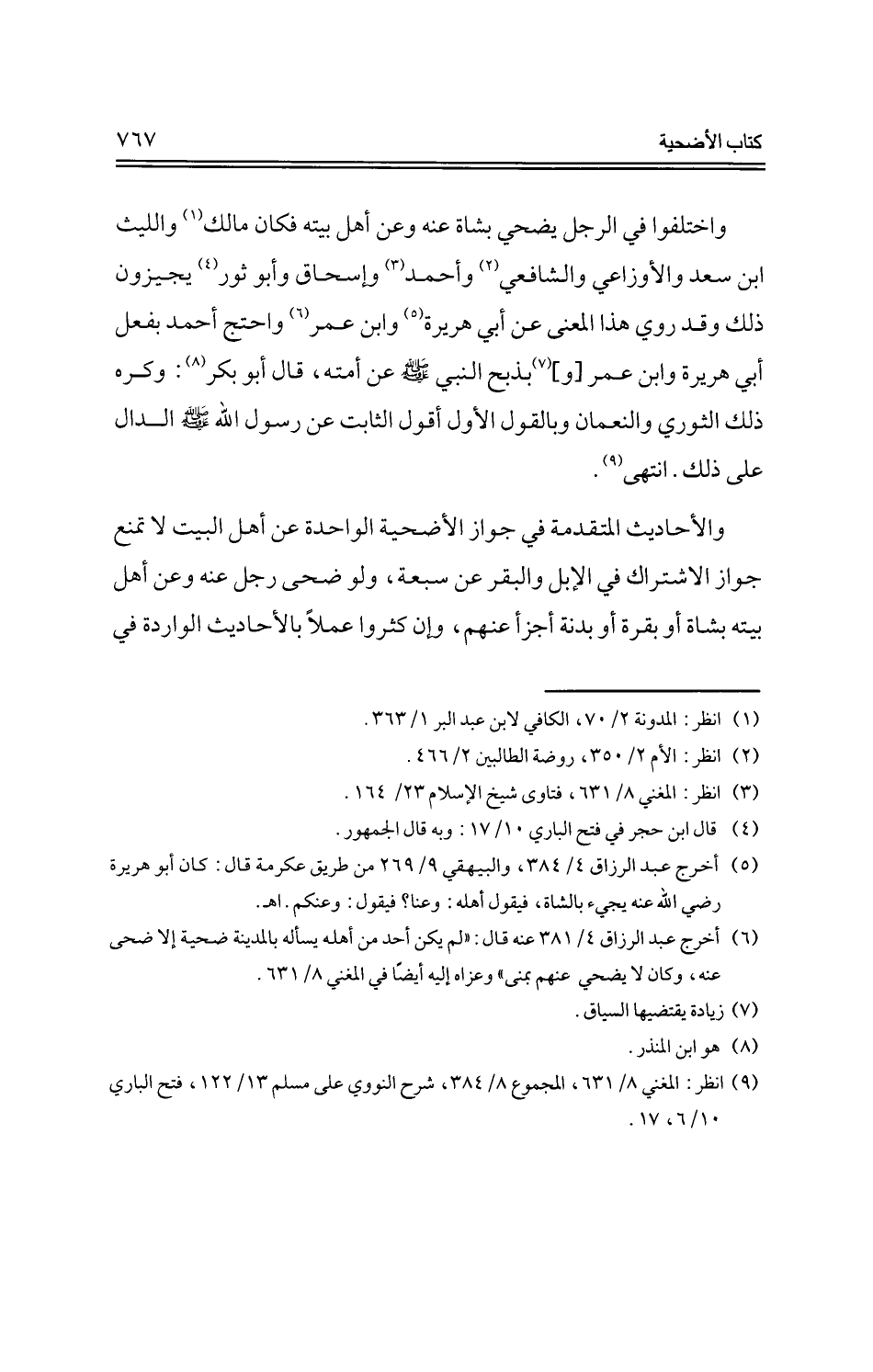 واختلفوا في الرجل يضحي بشاة عنه وعن أهل بيته فكان مالك والليث ابن سعد والأوزاعي والشافعي وأحمد وإسحاق وأبو ثور يجيزون ذلك وقدروي هذا المعنى عن أبي هريرة وابن عمر واحتج أحمد بفعل أبي هريرة وابن عمر [و] بذبح النبي -صلى الله عليه وسلم- عن أمته، قال أبو بكر: وكره ذلك الثوري والنعمان وبالقول الأول أقول الثابت عن رسول الله -صلى الله عليه وسلم- الدال على ذلك. انتهى.