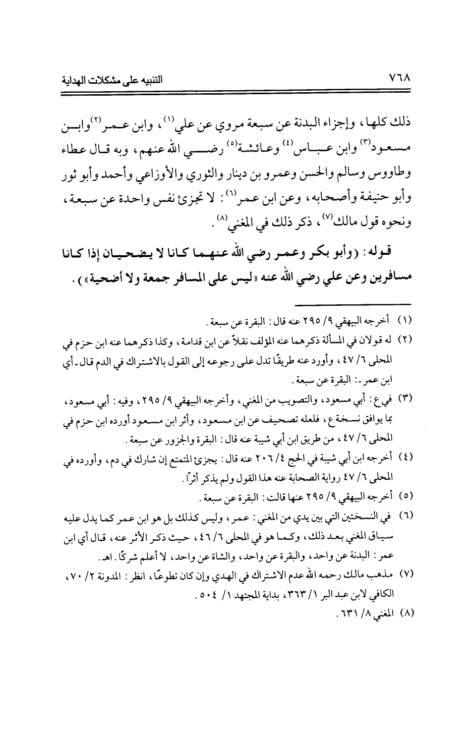 ذلك كلها، وإجزاء البدنة عن سبعة مروي عن علي، وابن عمر وابن مسعود وابن عباس وعائشة -رضي الله عنهم-، وبه قال عطاء وطاووس وسالم والحسن وعمر بن دينار والثوري والأوزاعي وأحمد وأبو ثور وأبو حنيفة وأصحابه، وعن ابن عمر: لا تجزئ نفس واحدة عن سبعة، ونحوه قول مالك، ذكر ذلك في المغني.