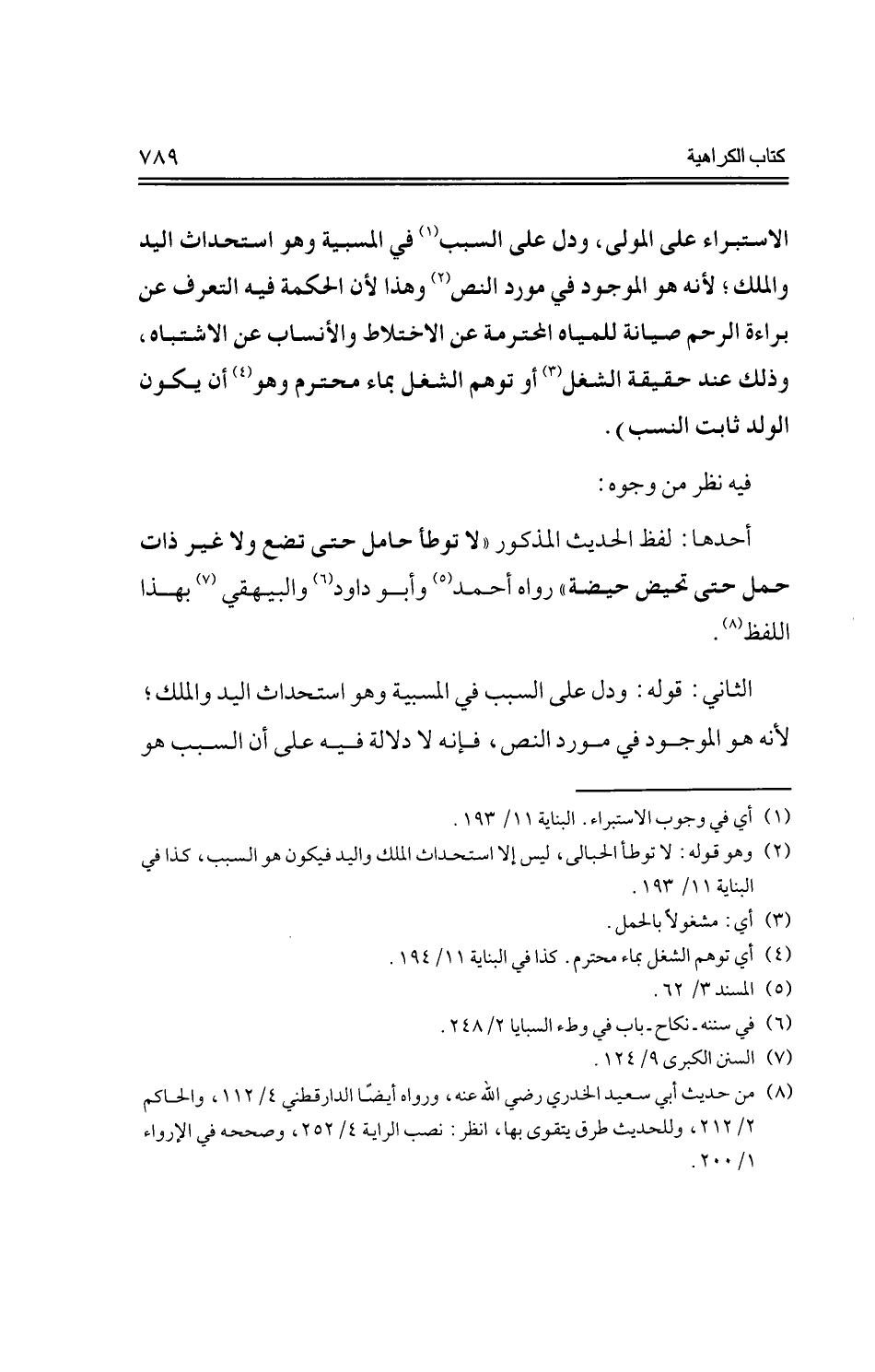 الاستبراء على المولى، ودل على السبب في المسبية وهو استحدث اليد والملك؛ لأنه هو الموجود في مورد النص وهذا لأن الحكمة فيه التعرف عن براءة الرحم صيانة للمياه المحترمة عن الاختلاط والأنساب عن الاشتباه، وذلك عند حقيقة الشغل أو توهم الشغل بماء محتوم وهو أن يكون الولد ثابت النسب).