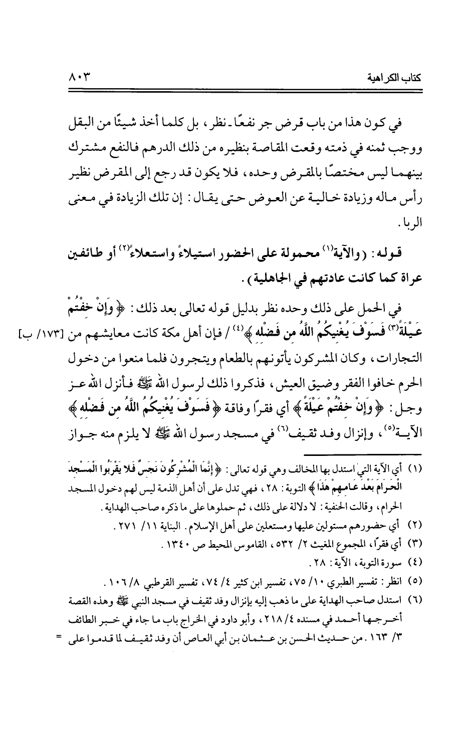 في الحمل على ذلك وحده نظر بدليل قوله تعالى بعد ذلك: {وإن خفتم عيلة فسوف يغنيكم الله من فضله} / فإن أهل مكة كانت معايشهم من التجارات، وكان المشركون يأتونهم بالطعام ويتجرون فلما منعوا من دخول الحرم خافوا الفقرة وضيق العيش، فذكروا ذلك لرسول الله -صلى الله عليه وسلم- فأنزل الله عز وجل: {وإِن خفتم عيلة} أي فقرًا وفاقة {فسوف يغنيكم الله من فضله} الآية، وإنزال وفد ثقيف في مسجد رسول الله -صلى الله عليه وسلم- لا يلزم منه جواز