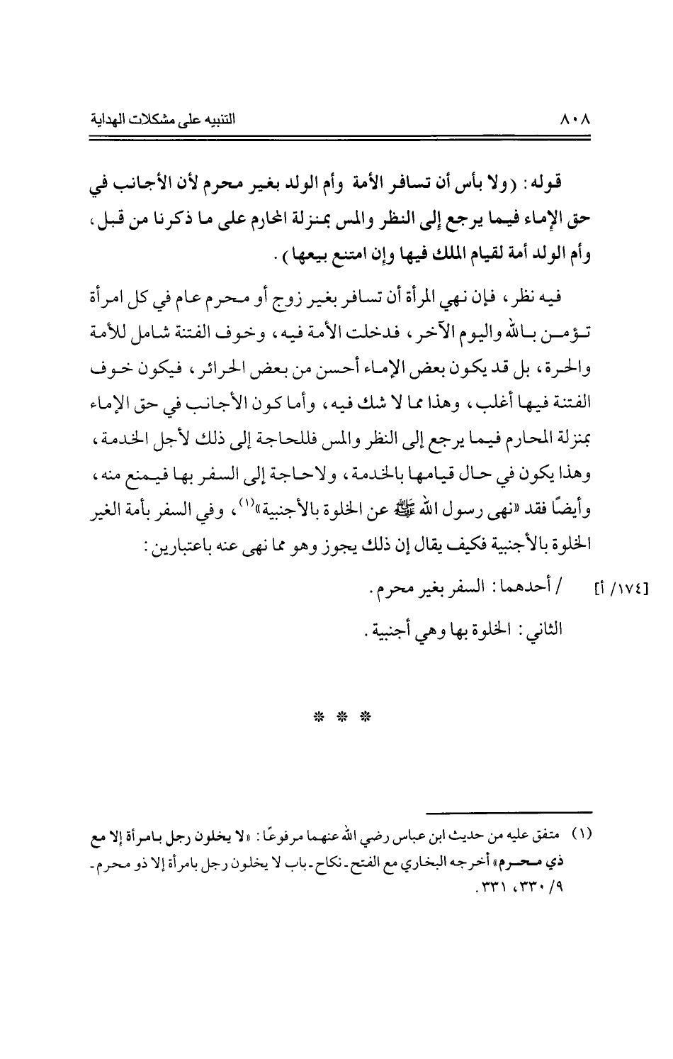 فيه نظر، فإن نهي المرأة أن تسافر بغير زوج أو محرم عام في كل امرأة تؤمن بالله واليوم الآخر، فدخلت الأمة فيه، وخوف الفتنة شامل للأمة والحرة، بل قد يكون بعض الإماء أحسن من بعض الحرائر، فيكون خوف الفتنة فيها أغلب، وهذا مما لا شك فيه، وأما كون الأجانب في حق الإماء بمنزلة المحارم فيما يرجع إلى النظر والمس فللحاجة إلى ذلك لأجل الخدمة، وهذا يكون في حال قيامها بالخدمة، ولا حاجة إلى السفر بها فيمنع منه، وأيضًا فقد "نهى رسول الله -صلى الله عليه وسلم- عن الخلوة بالأجنبية"، وفي السفر بأمة الغير الخلوة بالأجنبية فكيف يقال إن ذلك يجوز وهو مما نهى عنه باعتبارين:
