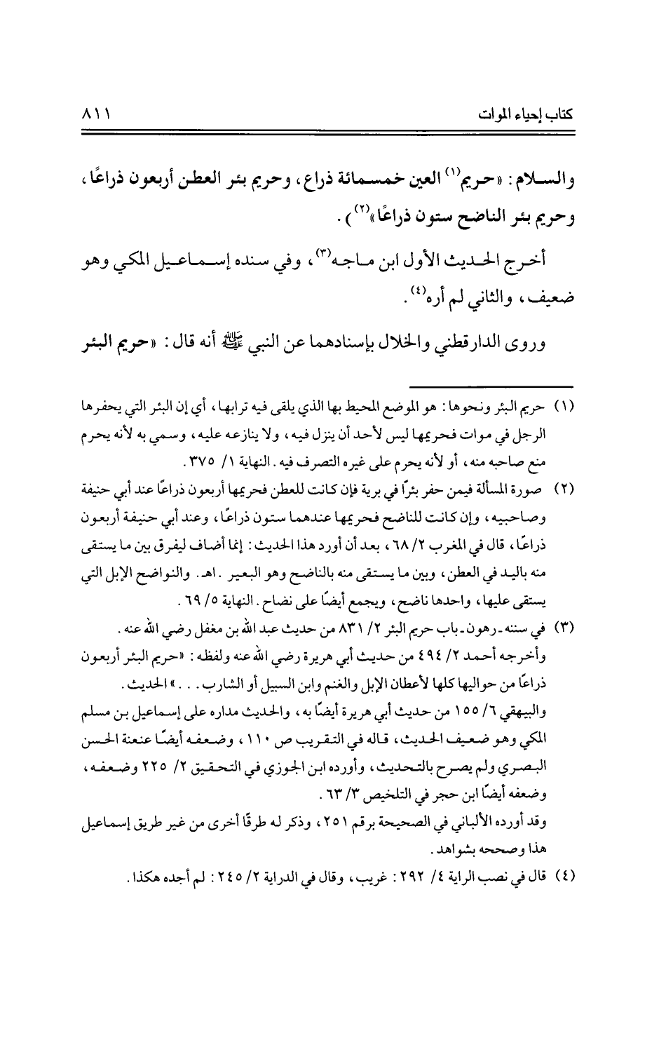 والسلام: "حريم العين خمسمائة ذراع، وحريم بئر العطن أربعون ذراعًا، وحريم بئر الناضح ستون ذراعًا").