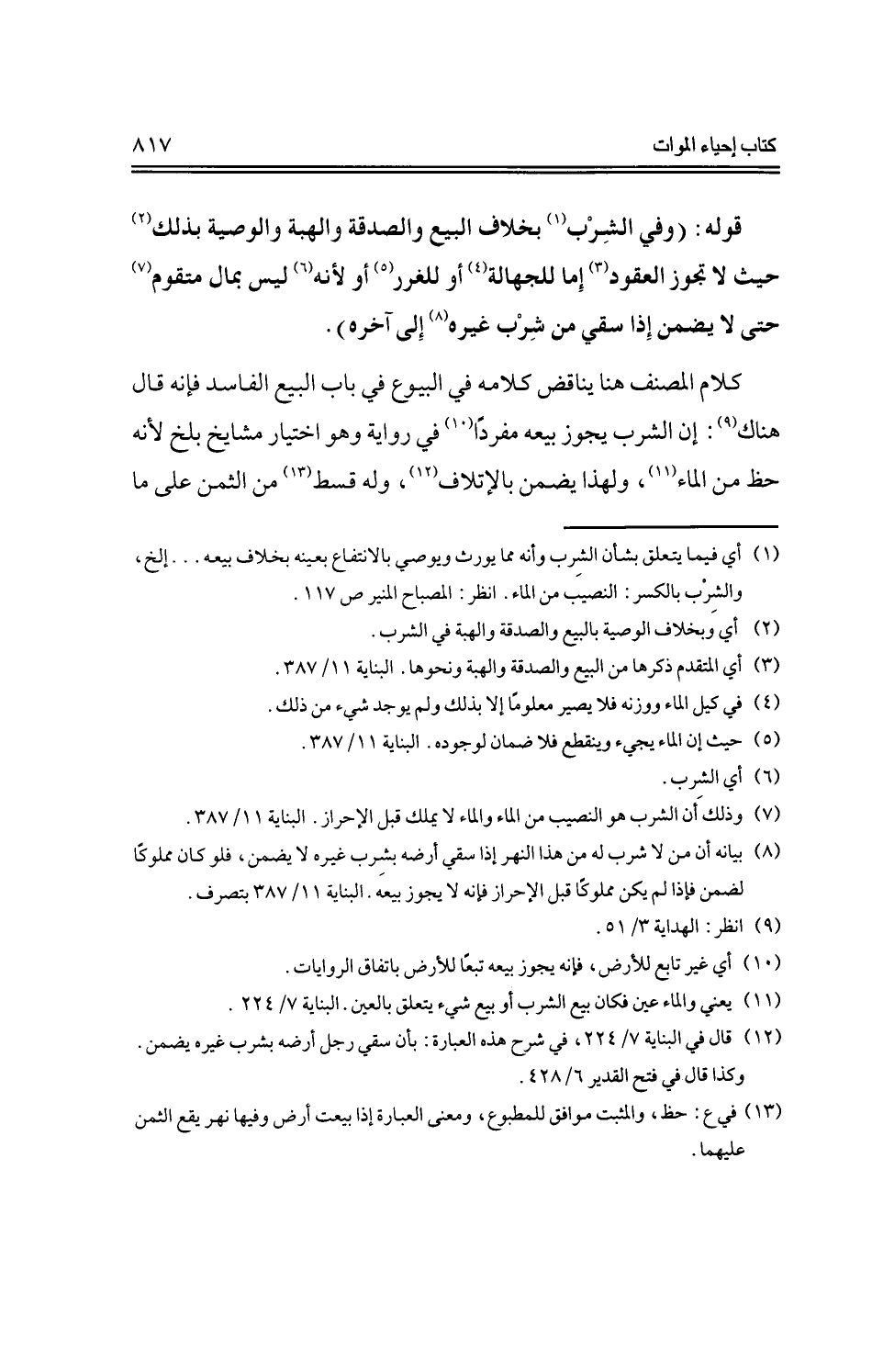 كلام المصنف هنا يناقض كلامه في البيوع في باب البيع الفاسد فإنه قال هناك: إن الشرب يجوز بيعه مفردًا في رواية وهو اختيار مشايخ بلخ لأنه حظ من الماء، ولهذا يضمن بالإتلاف، وله قسط من الثمن على ما