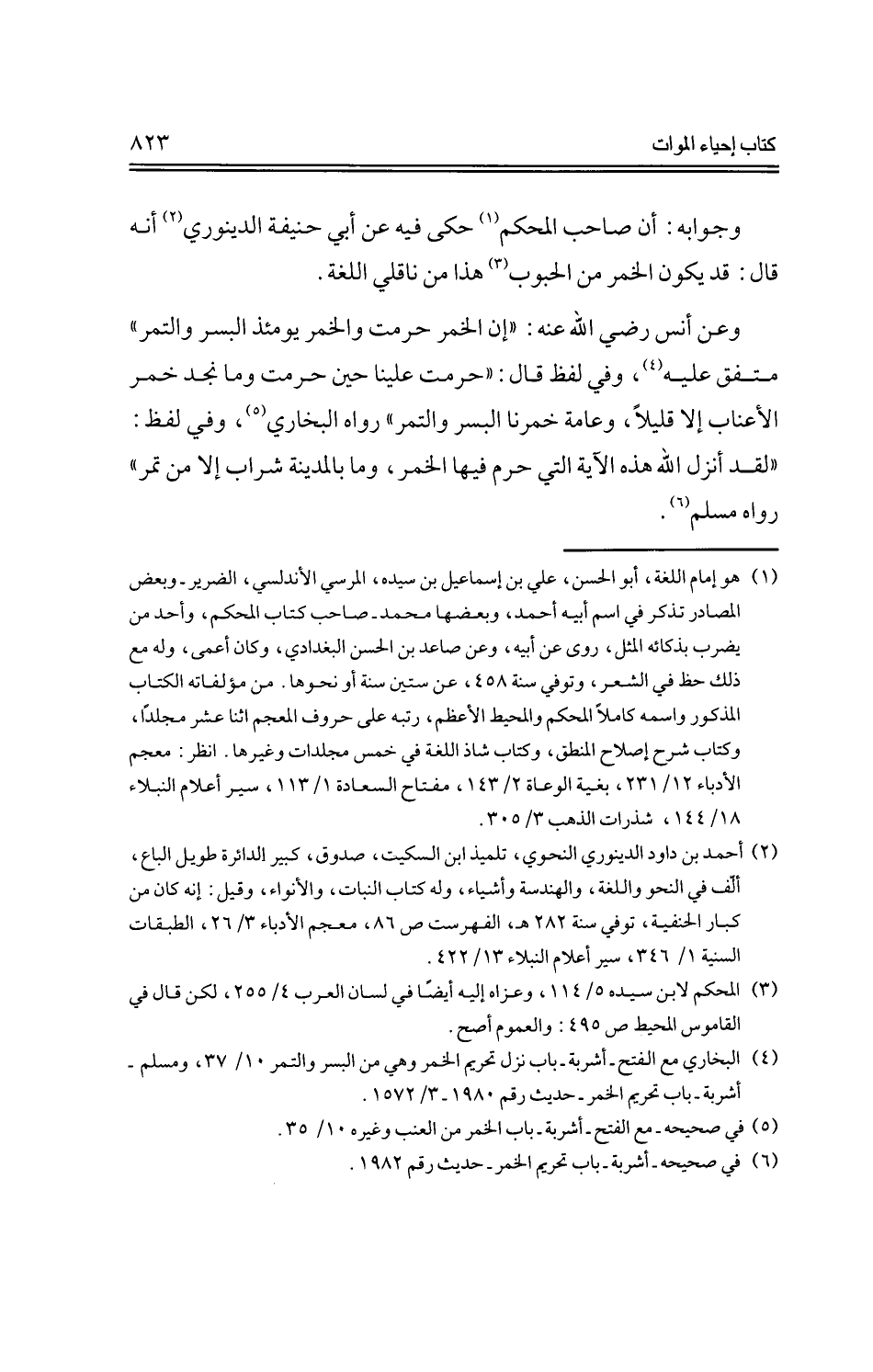 وجوابه: أن صاحب المحكم حكى فيه عن أبي حنيفة الدينوري أنه قال: قد يكون الخمر من الحبوب هذا من ناقلي اللغة.