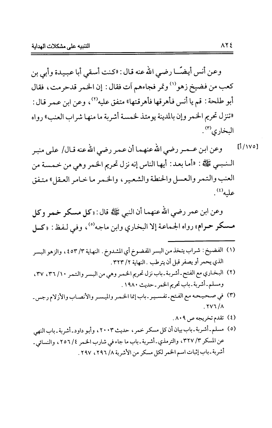 وعن أنس أيضًا -رضي الله عنه- قال: "كنت أسقي أبا عبيدة وأبي بن كعب من فضيخ زهو وتمر فجاءهم آت فقال: إن الخمر قد حرمت، فقال أبو طلحة: قم يا أنس فأهرقها فأهرقتها" متفق عليه، وعن ابن عمر قال: "تنزل تحريم الخمر وإن بالمدينة يومئذ لخمسة أشربة ما منها شراب العنب" رواه البخاري.