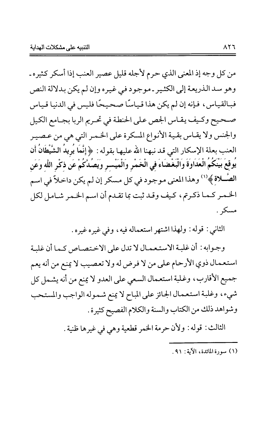 من كل وجه إذ المعنى الذي حرم لأجله قليل عصير العنب إذا أسكر كثيره -وهو سد الذريعة إلى الكثير- موجود في غيره وإن لم يكن بدلالة النص فبالقياس، فإنه إن لم يكن هذا قياسًا صحيحًا فليس في الدنيا قياس صحيح وكيف يقاس الجص على الحنطة في تحريم الربا بجامع الكيل والجنس ولا يقاس بقية الأنواع المسكرة على الخمر التي هي من عصير العنب بعلة الإسكار التي قد نبهنا الله عليها بقوله: {إنما يريد الشيطان أن يوقع بينكم العداوة والبغضاء في الخمر والميسر ويصدكم عن ذكر الله وعن الصلاة} وهذا المعنى موجود في كل مسكر إن لم يكن داخلاً في اسم الخمر كما ذكرتم، كيف وقد ثبت بما تقدم أن اسم الخمر شامل لكل مسكر.