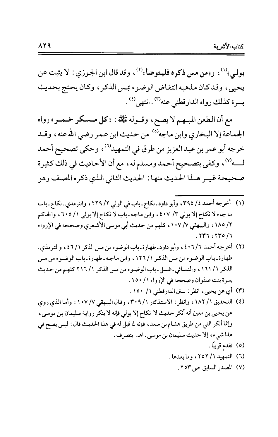 بولي"، و "من مس ذكره فليتوضأ"، وقد قال ابن الجوزي: لا يثبت عن يحيى، وقد كان مذهبه انتقاض الوضوء بمس الذكر، وكان يحتج بحديث بسرة كذلك رواه الدارقطني عنه. انتهى.