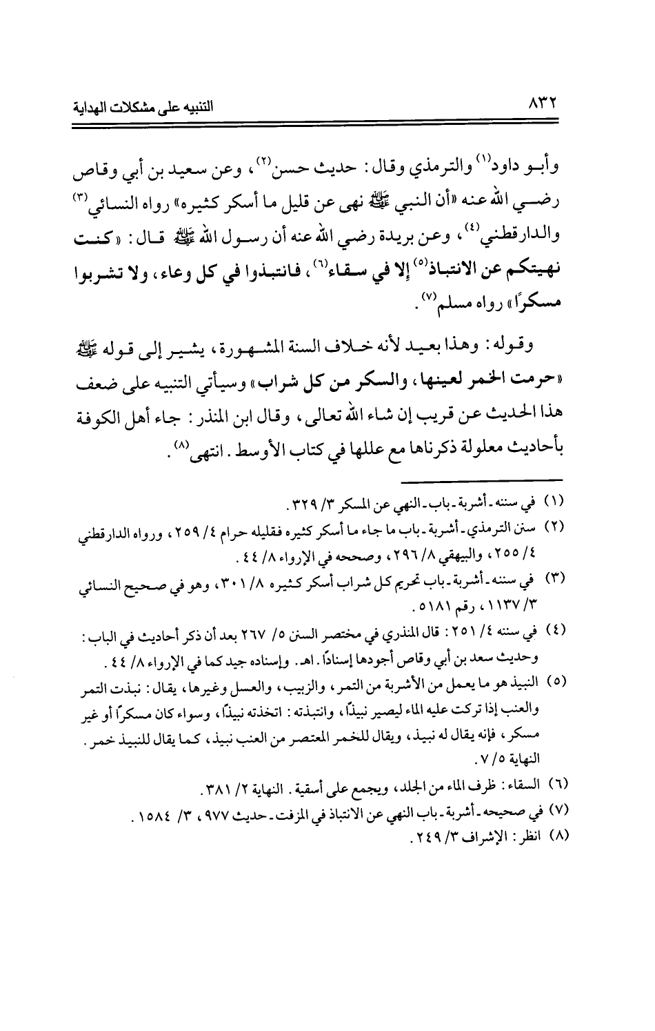وأبو داود والترمذي وقال: حديث حسن، وعن سعيد بن أبي وقاص -رضي الله عنه- "أن النبي -صلى الله عليه وسلم- نهى عن قليل ما أسكر كثيره" رواه النسائي والدارقطني، وعن بريدة -رضي الله عنه- أن رسول الله -صلى الله عليه وسلم- قال: "كنت نهيتكم عن الانتباذ إلا في سقاء، فانتبذوا فيكل وعاء، ولا تشربوا مسكرًا" رواه مسلم.