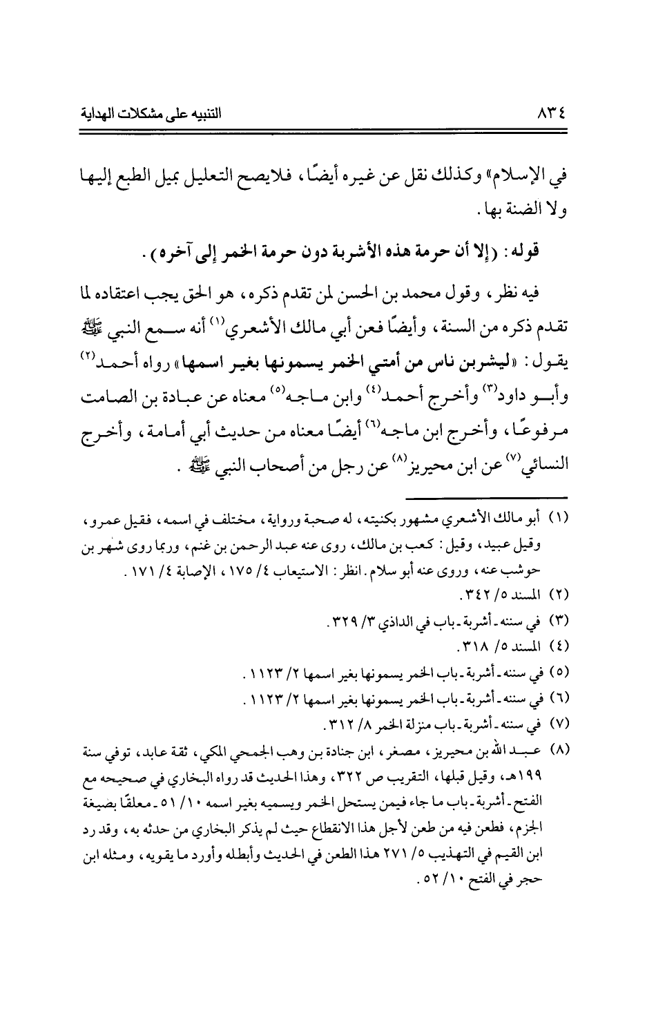 فيه نظر، وقول محمد بن الحسن لمن تقدم ذكره، هو الحق يجب اعتقاده لما تقدم ذكره من السنة، وأيضًا فعن أبي مالك الأشعري أنه سمع النبي -صلى الله عليه وسلم- يقول: "ليشربن ناس من أمتي الخمر يسمونها بغير اسمها" رواه أحمد وأبو داود وأخرج أحمد وابن ماجه معناه عن عبادة بن الصامت مرفوعًا، وأخرج ابن ماجه أيضًا معناه من حديث أبي أمامة، وأخرج النسائي عن ابن محيريز عن رجل من أصحاب النبي -صلى الله عليه وسلم-.