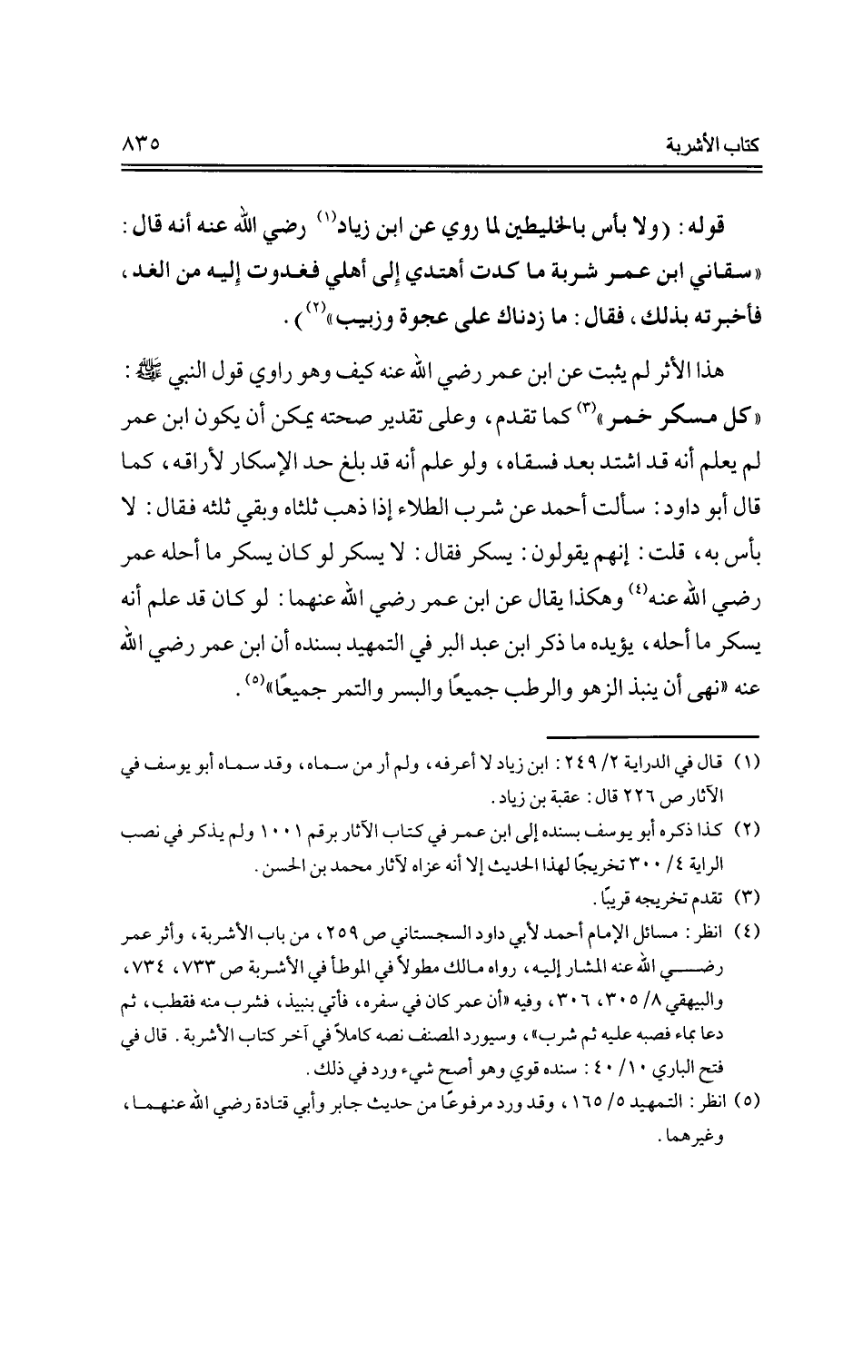 هذا الأثر لم يثبت عن ابن عمر -رضي الله عنه- كيف وهو راوي قول النبي -صلى الله عليه وسلم-: "كل مسكر خمر" كما تقدم، وعلى تقدير صحته يمكن أن يكون ابن عمر لم يعلم أنه قد اشتد بعد فسقاه، ولو علم أنه قد بلغ حد الإسكار لأراقه، كما قال أبو داود: سألت أحمد عن شرب الطلاء إذا ذهب ثلثاه وبقي ثلثه فقال: لا بأس به، قلت: إنهم يقولون: يسكر فقال: لا يسكر لو كان يسكر ما أحله عمر -رضي الله عنه- وهكذا يقال عن بن عمر -رضي الله عنهما-: لو كان قد علم أنه يسكر ما أحله، يؤيده ما ذكر ابن عبد البر في التمهيد بسنده أن ابن عمر -رضي الله عنه- "نهى أن ينبذ الزهور والرطب جميعًا والبسر والتمر جميعًا".