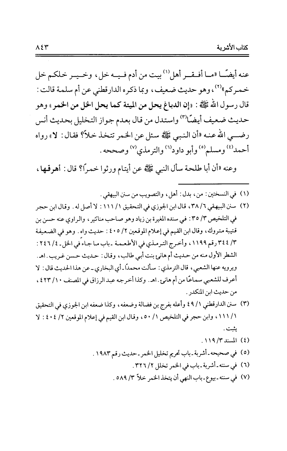 عنه- أيضًا "ما أفقر أهل بيت من أدم فيه خل، وخير خلكم خل خمركم"، وهو حديث ضعيف، وبما ذكره الدارقطني عن أم سلمة قالت: قال رسول الله -صلى الله عليه وسلم-: "إن الدباغ يحل من الميتة كما يحل الخل من الخمر" وهو حديث ضعيف أيضًا واستدل من قال بعدم جواز التخليل بحديث أنس -رضي الله عنه- "أن النبي -صلى الله عليه وسلم- سئل عن الخمر تتخذ خلاً؟ فقال: لا" رواه أحمد ومسلم وأبو داود والترمذي وصححه.