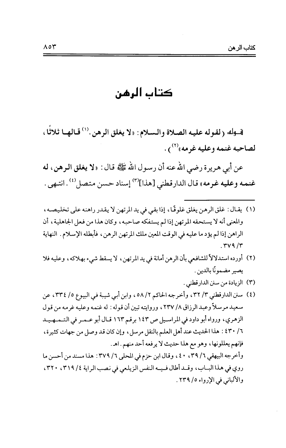 عن أبي هريرة -رضي الله عنه- أن رسول الله -صلى الله عليه وسلم- قال: "لا يغلق الرهن، له غنمه وعليه غرمه" قال الدارقطني [هذا] إسناد حسن متصل. انتهى.