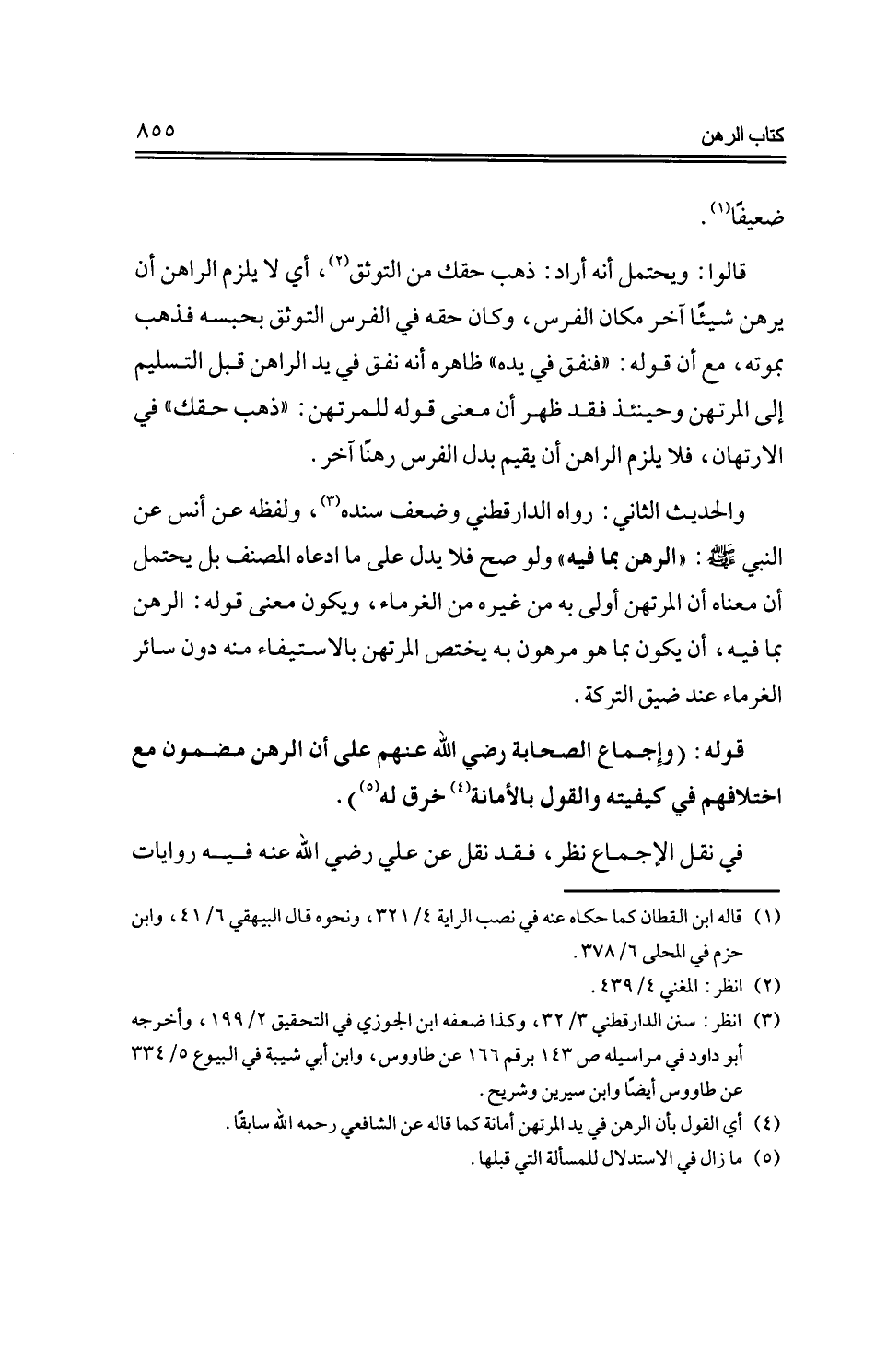 قوله: (وإجماع الصحابة -رضي الله عنهم- على أن الرهن مضمون مع اختلافهم في كيفيته والقول بالأمانة خرق له).