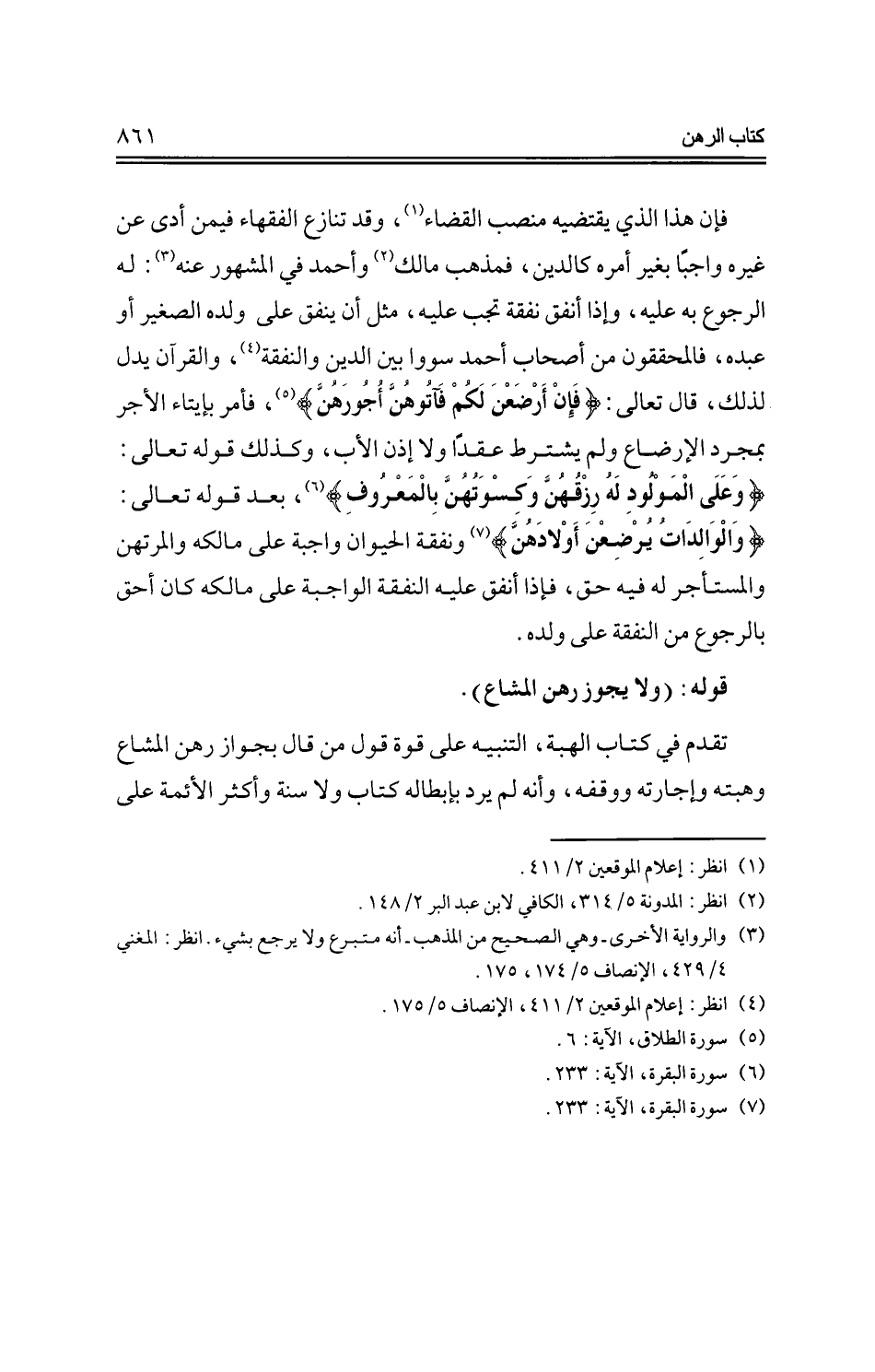 فإن هذا الذي يقتضيه منصب القضاء، وقد تنازع الفقهاء فيمن أدى عن غيره واجبًا بغير أمره كالدين، فمذهب مالك وأحمد في المشهور عنه: له الرجوع به عليه، وإذا أنفق نفقة تجب عليه، مثل أن ينفق على ولده الصغير أو عبده، فالمحققون من أصحاب أحمد سووا بين الدين والنفقة، والقرآن يدل لذلك، قال تعالى: {فإن أرضعن لكم فآتوهن أجورهن}، فأمر بإيتاء الأجر بمجرد الإرضاع ولم يشترط عقدًا ولا إذن الأب، وكذلك قوله تعالى: {وعلى المولود له رزقهن وكسوتهن بالمعروف}، بعد قوله تعالى: {والوالدات يرضعن أولادهن} ونفقة الحيوان واجبة على مالكه والمرتهن والمستأجر له فيه حق، فإذا أنفق عليه النفقة الواجبة على مالكه كان أحق بالرجوع من النفقة على ولده.
