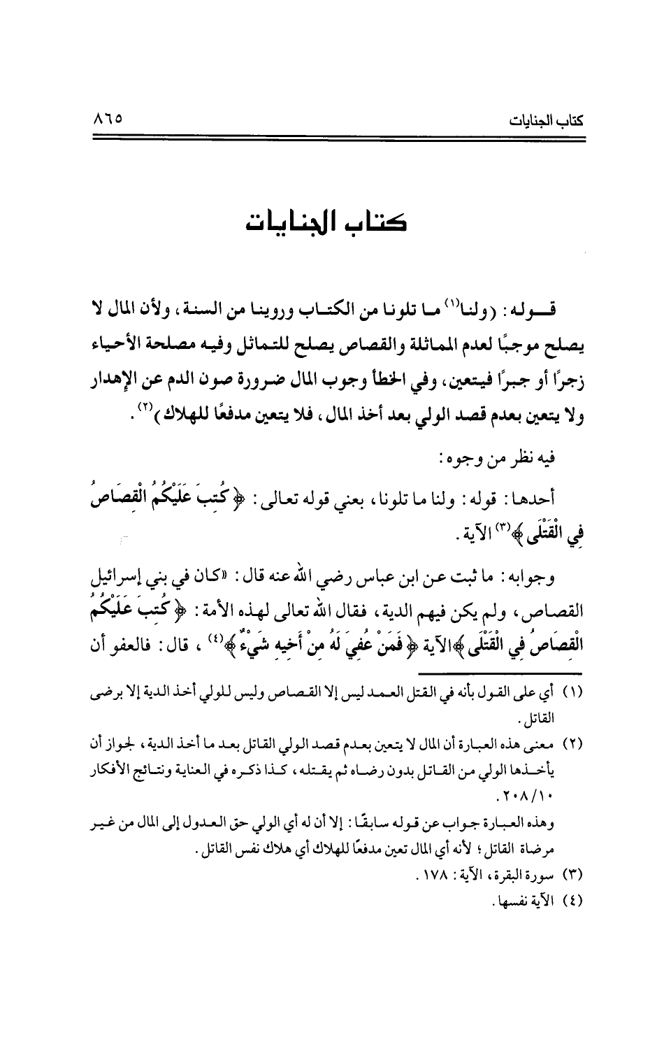 قوله: (ولنا ما تلونا من الكتاب وروينا من السنة، ولأن المال لا يصلح موجبًا لعدم المماثلة والقصاص يصلح للتماثل وفيه مصلحة الأحياء زجرًا أو جبرًا فيتعين، وفي الخطأ وجوب المال ضرورة صون الدم عن الإهدار ولا يتعين بعدم قص الولي بعد أخذ المال، فلا يتعين مدفعًا للهلاك).