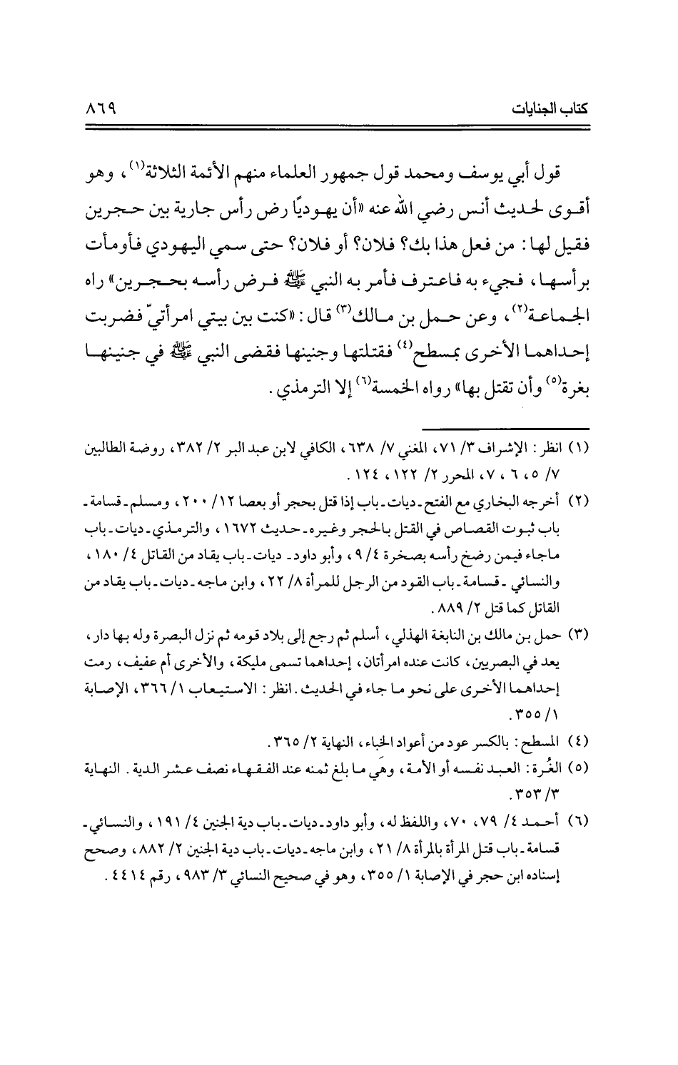 قول أبي يوسف ومحمد قول جمهور العلماء منهم الأئمة الثلاثة، وهو أقوى لحديث أنس رضي الله عنه "أن يهوديًا رض رأس جارية بين حجرين فقيل لها: من فعل هذا بك؟ فلان؟ أو فلان؟ حتى سمي اليهودي فأومأت برأسها، فجيء به فاعترف فأمر به النبي -صلى الله عليه وسلم- فرض رأسه بحجرين" رآه الجماعة، وعن حمل بن مالك قال: "كنت بين بيتي امرأتي فضربت إحداهما الأخرى بمسطح فقتلتها وجنينها فقضى النبي -صلى الله عليه وسلم- في جنينها بغرة وأن تقتل بها" رواه الخمسة إلا الترمذي.